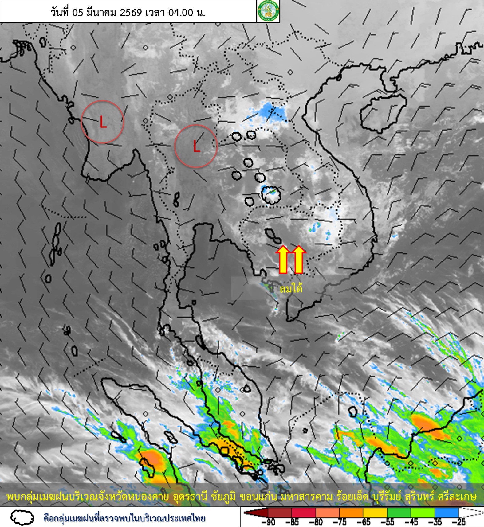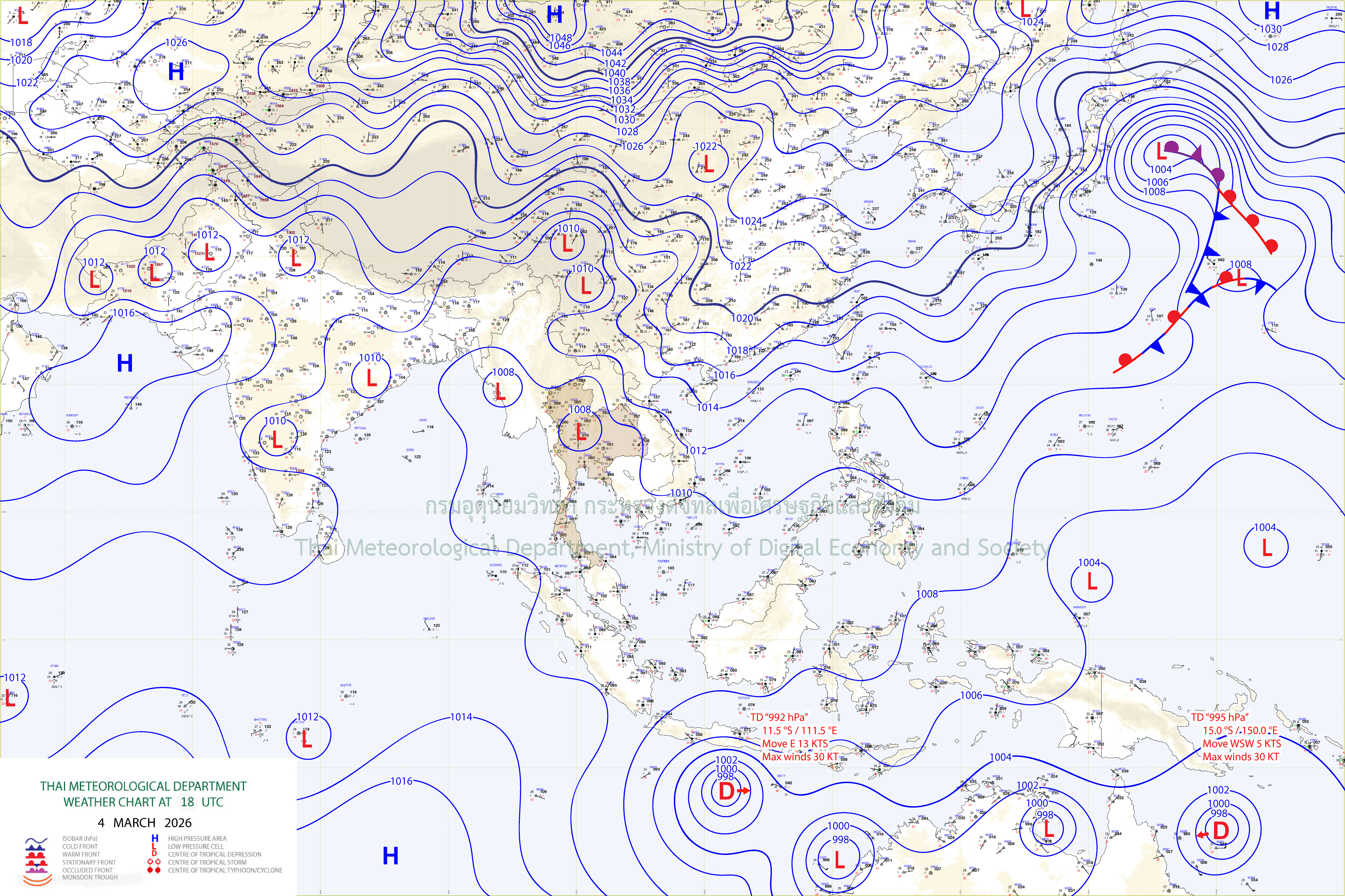 ลักษณะอากาศทั่วไป : พยากรณ์อากาศ 24 ชั่วโมงข้างหน้า ภาคตะวันออกเฉียงเหนือ ภาคตะวันออก ภาคเหนือ และภาคกลางจะมีพายุฤดูร้อนเกิดขึ้น โดยมีลักษณะของพายุฝนฟ้าคะนอง ลมกระโชกแรง รวมถึงฟ้าผ่าที่อาจเกิดขึ้นได้บางพื้นที่ ทั้งนี้เนื่องจากบริเวณความกดอากาศสูงหรือมวลอากาศเย็นจากประเทศจีนแผ่ปกคลุมภาคตะวันออกเฉียงเหนือตอนบนและทะเลจีนใต้แล้ว ส่งผลทำให้มีลมใต้และลมตะวันออกเฉียงใต้พัดนำความชื้นจากทะเลจีนใต้เข้าปกคลุมภาคตะวันออกเฉียงเหนือ ภาคตะวันออก และอ่าวไทยตอนบน ในขณะที่ประเทศไทยตอนบนมีอากาศร้อน ขอให้ประชาชนบริเวณดังกล่าวระวังอันตรายจากพายุฤดูร้อน โดยหลีกเลี่ยงการอยู่ในที่โล่งแจ้งใต้ต้นไม้ใหญ่ สิ่งปลูกสร้าง และป้ายโฆษณาที่ไม่แข็งแรง สำหรับเกษตรกรควรเสริมความแข็งแรงให้ไม้ผล และเตรียมการป้องกันความเสียหายที่อาจเกิดขึ้นกับผลผลิตทางการเกษตรและสัตว์เลี้ยง รวมทั้งดูแลรักษาสุขภาพในช่วงที่สภาพอากาศร้อนไว้ด้วย สำหรับภาคใต้ตอนล่างมีฝนฟ้าคะนองบางแห่ง เนื่องจากลมฝ่ายตะวันตกและลมตะวันออกพัดปกคลุมทะเลอันดามัน ภาคใต้ และอ่าวไทย ส่วนบริเวณอ่าวไทยตอนล่างและทะเลอันดามันมีคลื่นสูงประมาณ 1 เมตร บริเวณที่มีฝนฟ้าคะนองคลื่นสูงมากกว่า 2 เมตร ขอให้ชาวเรือบริเวณอ่าวไทยและทะเลอันดามันหลีกเลี่ยงการเดินเรือในบริเวณที่มีฝนฟ้าคะนองไว้ด้วย