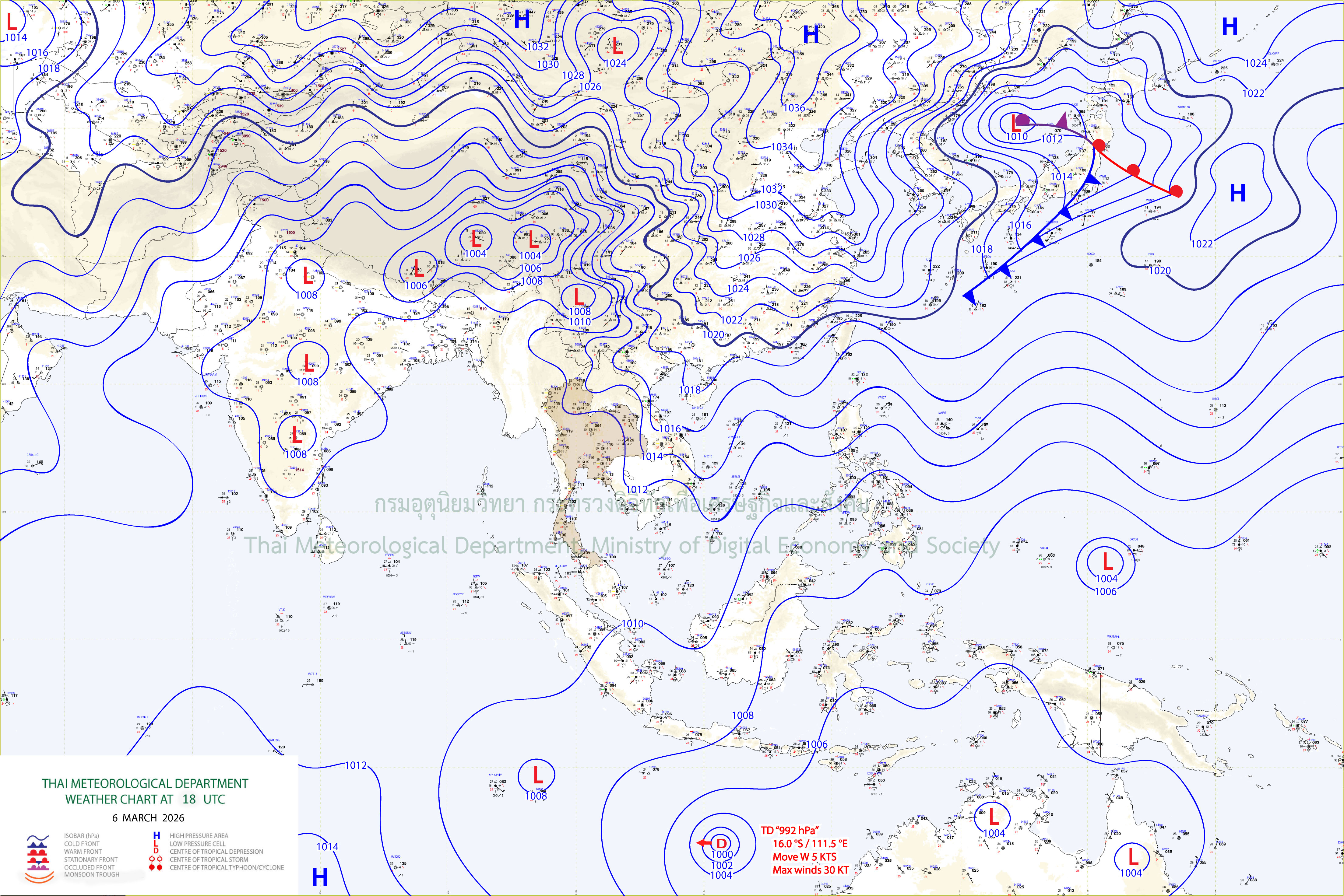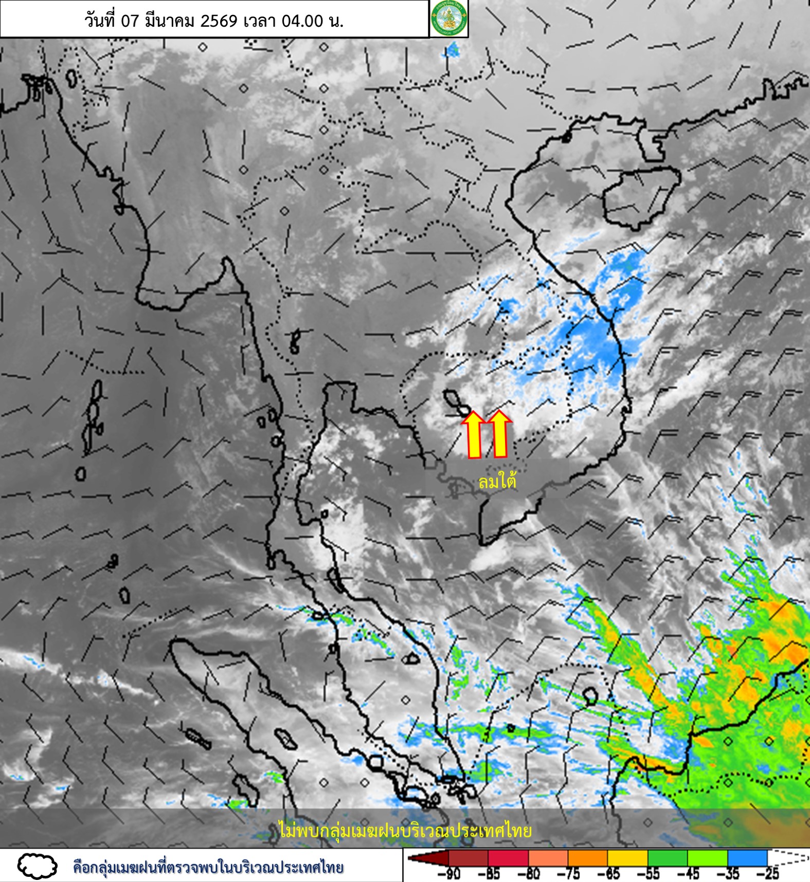 ลักษณะอากาศทั่วไป : พยากรณ์อากาศ 24 ชั่วโมงข้างหน้า ประเทศไทยตอนบนมีฝนลดลง แต่ยังคงมีฝนฟ้าคะนอง และมีลมกระโชกแรงเกิดขึ้นได้บางพื้นที่ เนื่องจากบริเวณความกดอากาศสูงหรือมวลอากาศเย็นจากประเทศจีนปกคลุมภาคตะวันออกเฉียงเหนือและทะเลจีนใต้ ส่งผลทำให้มีลมใต้และลมตะวันออกเฉียงใต้พัดนำความชื้นจากทะเลจีนใต้และอ่าวไทยเข้ามาปกคลุมประเทศไทยตอนบน ในขณะที่ประเทศไทยตอนบนมีอากาศร้อน ขอให้ประชาชนในบริเวณดังกล่าวระวังอันตรายฝนฟ้าคะนอง และลมกระโชกแรงไว้ด้วย