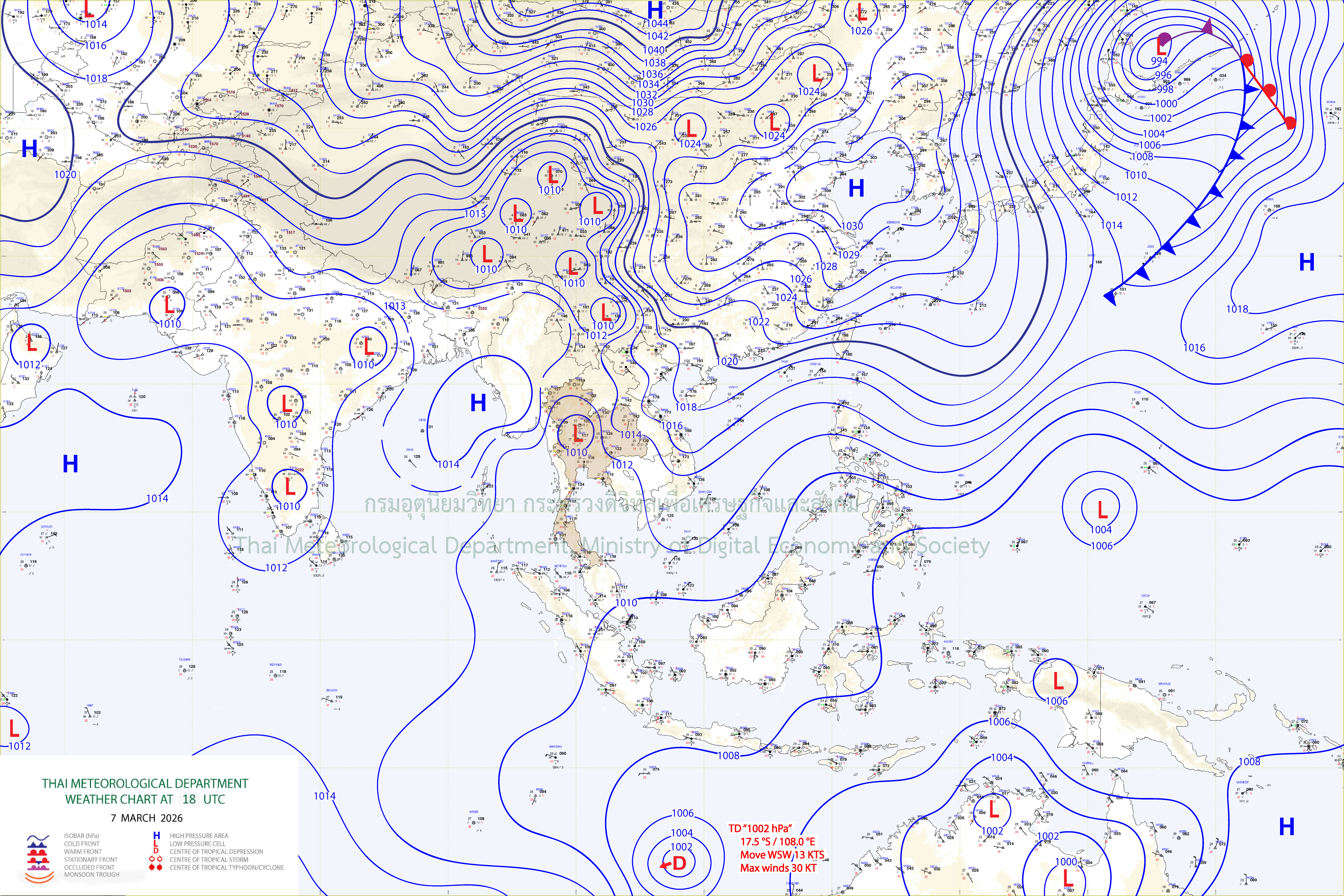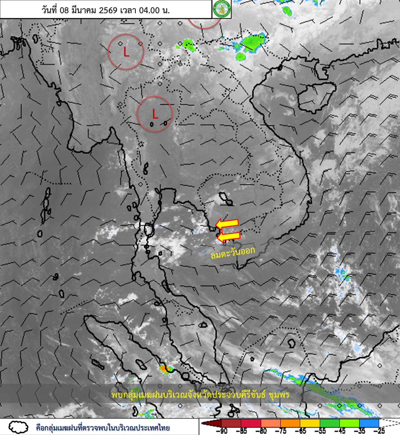 ลักษณะอากาศทั่วไป : ได้บางพื้นที่ เนื่องจากความกดอากาศต่ำเนื่องจากความร้อนปกคลุมประเทศไทยตอนบน ประกอบกับมีลมใต้และลมตะวันออกเฉียงใต้พัดนำความชื้นจากทะเลจีนใต้และอ่าวไทยเข้ามาปกคลุมประเทศไทยตอนบน ในขณะที่ประเทศไทยตอนบนมีอากาศร้อน ขอให้ประชาชนในบริเวณดังกล่าวระวังอันตรายจากฝนฟ้าคะนอง และลมกระโชกแรงไว้ด้วย สำหรับภาคใต้ยังคงมีฝนฟ้าคะนองเกิดขึ้นได้ในระยะนี้ เนื่องจากลมตะวันออกและลมตะวันออกเฉียงใต้พัดปกคลุมอ่าวไทย ภาคใต้ และทะเลอันดามัน โดยบริเวณอ่าวไทยตอนล่างมีคลื่นสูง 1-2 เมตร บริเวณที่มีฝนฟ้าคะนองคลื่นสูงมากกว่า 2 เมตร ขอให้ชาวเรือบริเวณอ่าวไทยและทะเลอันดามันหลีกเลี่ยงการเดินเรือในบริเวณที่มีฝนฟ้าคะนองไว้ด้วย อนี่ง ในช่วงวันที่ 11 - 13 มี.ค. 69 บริเวณประเทศไทยตอนบนจะมีพายุฤดูร้อนเกิดขึ้น โดยมีลักษณะของพายุฝนฟ้าคะนอง ลมกระโชกแรง ลูกเห็บตก และฝนตกหนักบางแห่ง รวมถึงฟ้าผ่าที่อาจเกิดขึ้นได้บางพื้นที่ เนื่องจากบริเวณความกดอากาศสูงหรือมวลอากาศเย็นจากประเทศจีนจะแผ่ลงมาปกคลุมภาคเหนือตอนบน ภาคตะวันออกเฉียงเหนือ และทะเลจีนใต้ ส่งผลทำให้มีลมใต้และลมตะวันออกเฉียงใต้พัดนำความชื้นเข้ามาปกคลุมภาคตะวันออกเฉียงเหนือ ภาคกลาง ภาคตะวันออก และอ่าวไทย ในขณะที่ประเทศไทยตอนบนมีอากาศร้อน