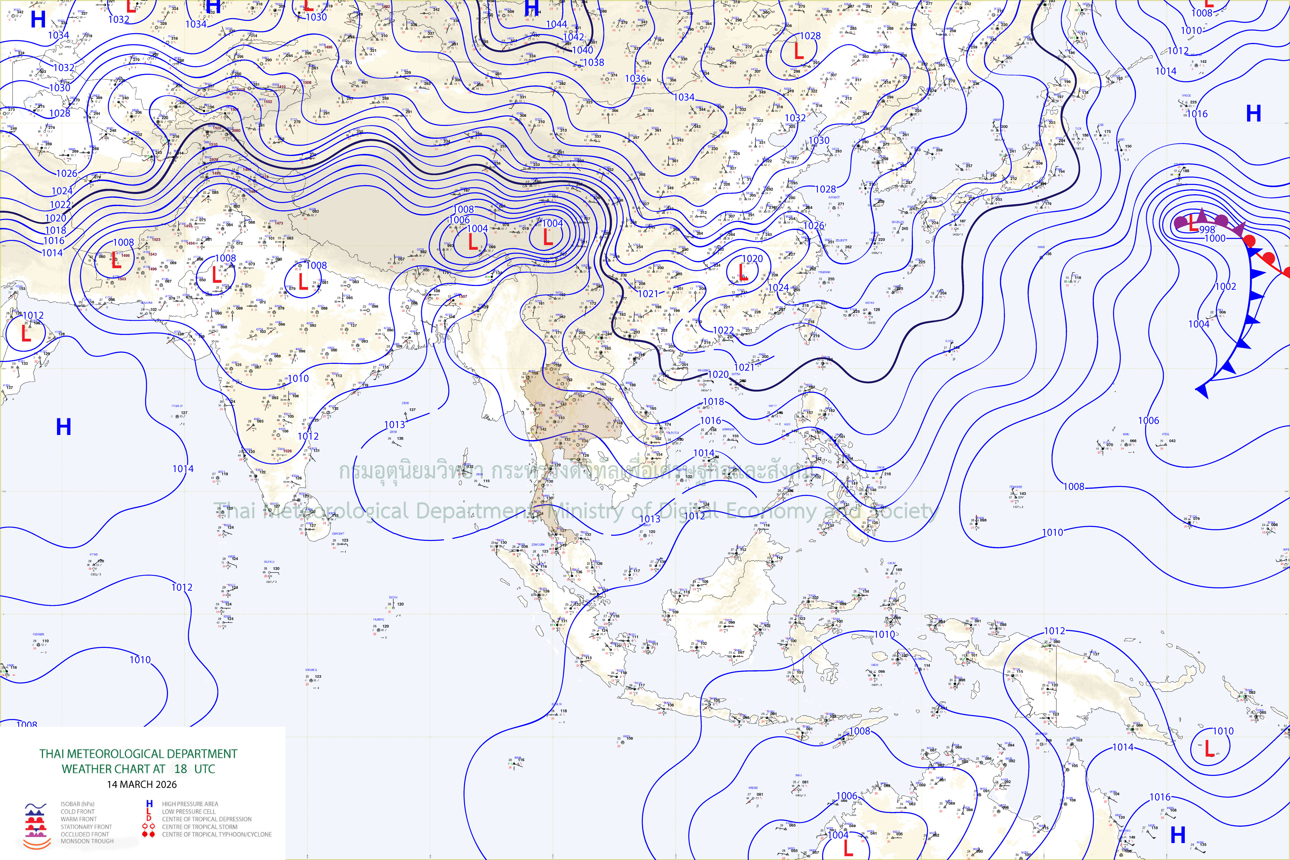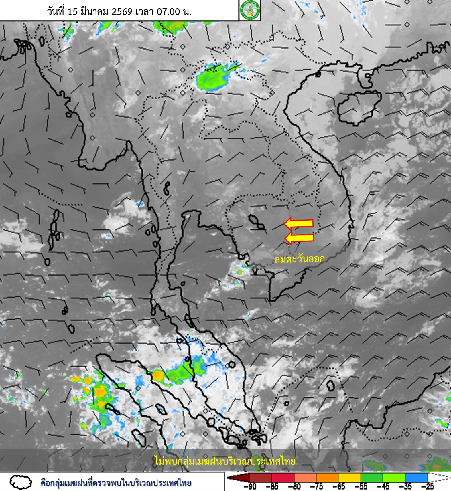ลักษณะอากาศทั่วไป : พยากรณ์อากาศ 24 ชั่วโมงข้างหน้า ประเทศไทยตอนบนมีอากาศร้อนในตอนกลางวัน แต่ยังคงมีฝนฟ้าคะนองบางแห่ง บริเวณภาคเหนือ ภาคกลางตอนล่าง และภาคตะวันออก เนื่องจากบริเวณความกดอากาศสูงหรือมวลอากาศเย็นกำลังปานกลางจากประเทศจีนยังคงปกคลุมภาคตะวันออกเฉียงเหนือ และทะเลจีนใต้ ส่งผลทำให้มีลมตะวันออกและลมตะวันออกเฉียงใต้พัดปกคลุมประเทศไทยตอนบน ขอให้ประชาชนบริเวณดังกล่าว ระวังอันตรายจากฝนฟ้าคะนอง รวมทั้งดูแลรักษาสุขภาพเนื่องจากสภาพอากาศที่ร้อนขึ้นไว้ด้วย