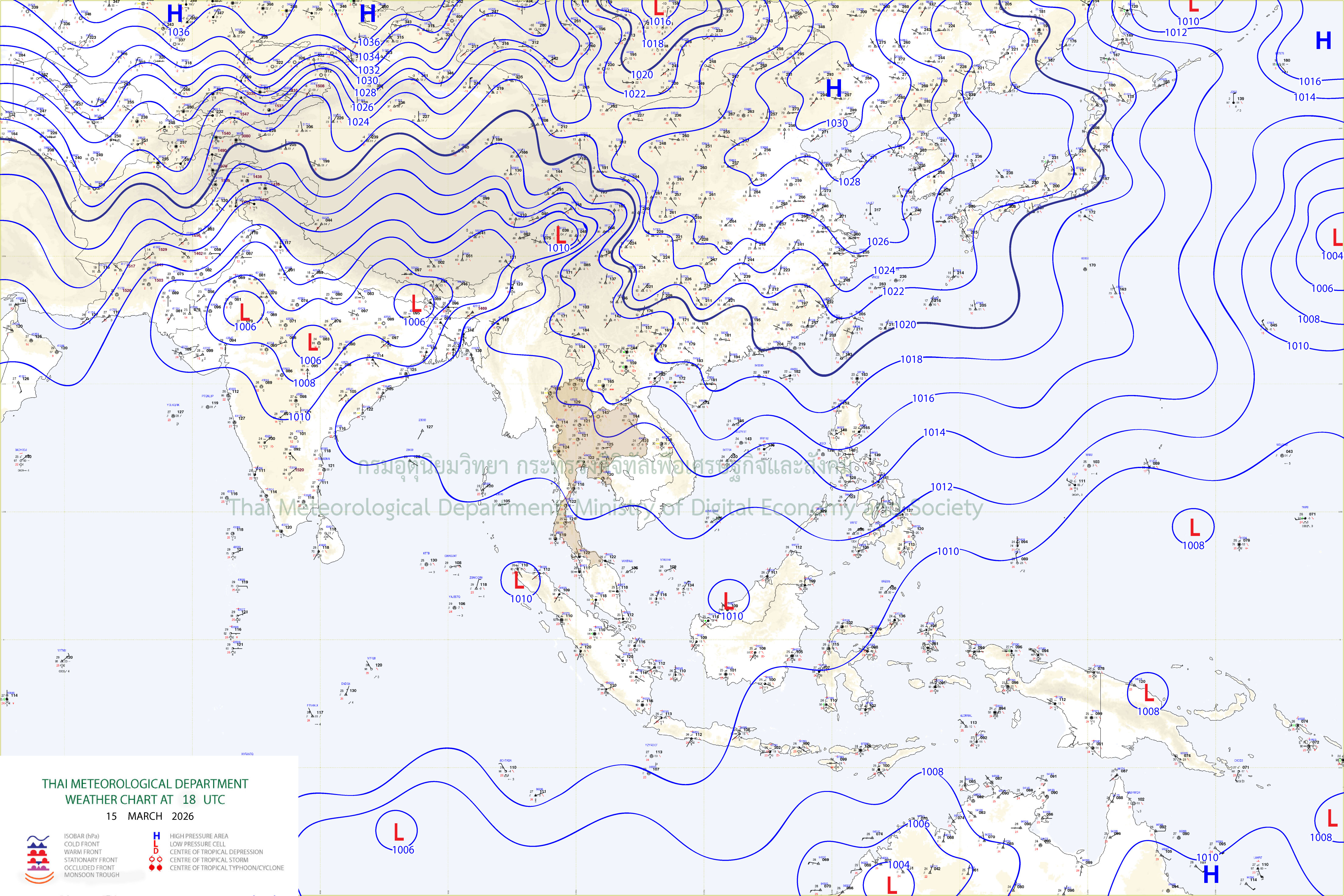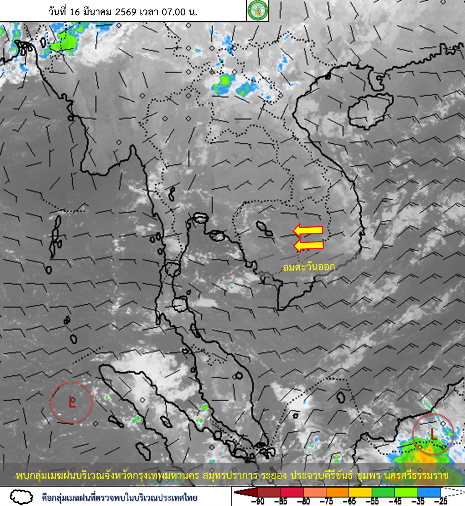 ลักษณะอากาศทั่วไป : พยากรณ์อากาศ 24 ชั่วโมงข้างหน้า ประเทศไทยตอนบนมีอากาศร้อนในตอนกลางวัน แต่ยังคงมีฝนฟ้าคะนองบางแห่ง บริเวณภาคเหนือ ภาคกลางตอนล่าง และภาคตะวันออก เนื่องจากบริเวณความกดอากาศสูงหรือมวลอากาศเย็นกำลังอ่อนจากประเทศจีนยังคงปกคลุมภาคตะวันออกเฉียงเหนือ และทะเลจีนใต้ ส่งผลทำให้ลมตะวันออกและลมตะวันออกเฉียงใต้ที่พัดปกคลุมประเทศไทยตอนบนมีกำลังอ่อน ขอให้ประชาชนบริเวณดังกล่าว ระวังอันตรายจากฝนฟ้าคะนอง รวมทั้งดูแลรักษาสุขภาพเนื่องจากสภาพอากาศที่ร้อนขึ้นไว้ด้วย สำหรับภาคใต้มีฝนฟ้าคะนองบางแห่ง เนื่องจากลมตะวันออกพัดปกคลุมอ่าวไทย ภาคใต้ และทะเลอันดามัน ส่วนบริเวณอ่าวไทยตอนล่างมีคลื่นสูง 1-2 เมตร บริเวณที่มีฝนฟ้าคะนองคลื่นสูงมากกว่า 2 เมตร ชาวเรือบริเวณอ่าวไทยและทะเลอันดามันเดินเรือด้วยความระมัดระวัง และหลีกเลี่ยงการเดินเรือในบริเวณที่มีฝนฟ้าคะนองไว้ด้วย