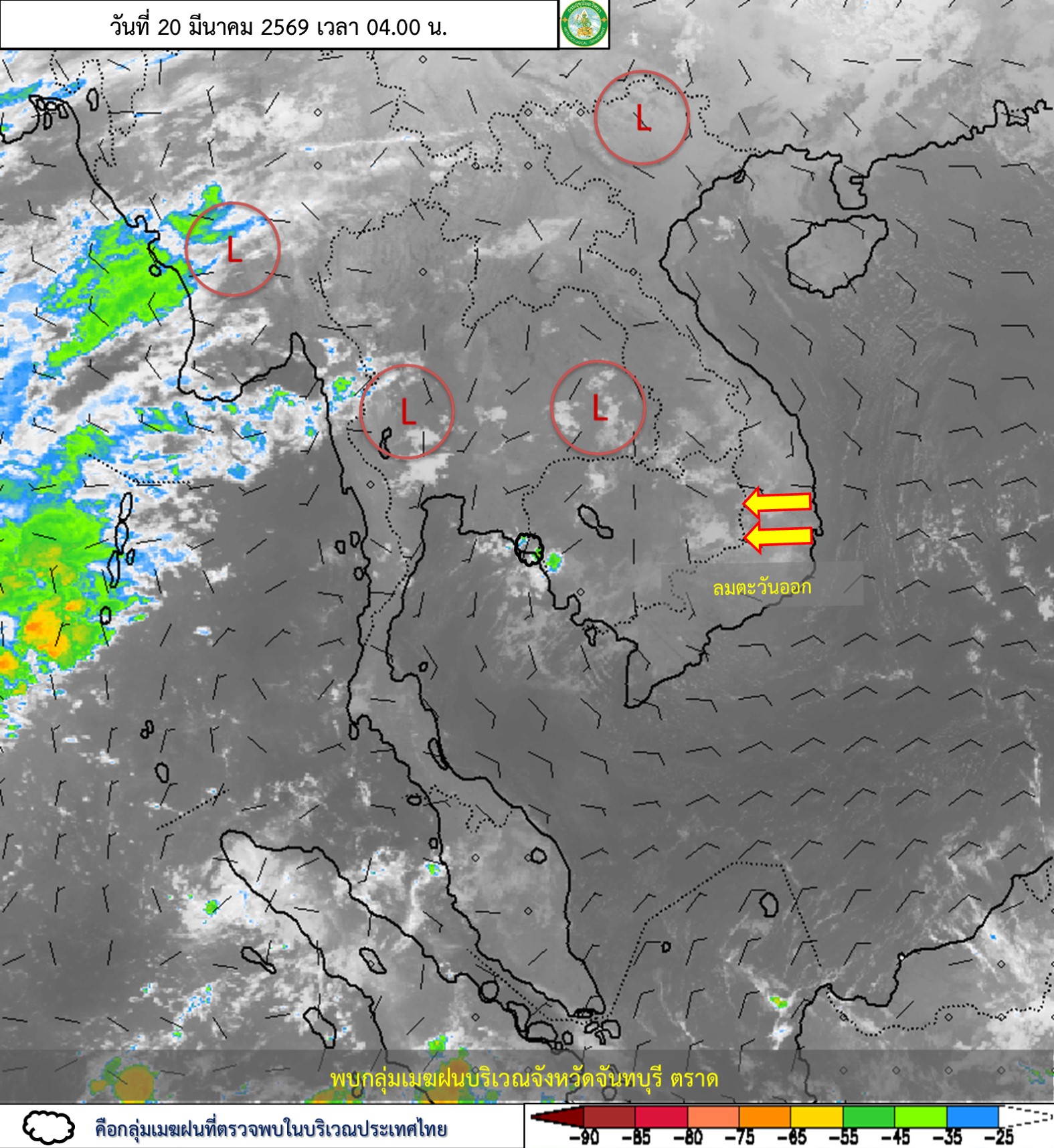 ลักษณะอากาศทั่วไป : พยากรณ์อากาศ 24 ชั่วโมงข้างหน้า ประเทศไทยตอนบนมีอากาศร้อนในตอนกลางวัน แต่ยังคงมีฝนฟ้าคะนองบางแห่ง ส่วนมากบริเวณภาคเหนือตอนล่าง ภาคตะวันออกเฉียงเหนือตอนล่าง ภาคกลาง และภาคตะวันออก เนื่องจากความกดอากาศต่ำเนื่องจากความร้อนปกคลุมประเทศไทยตอนบน ในขณะที่มีลมใต้และลมตะวันออกเฉียงใต้พัดนำความชื้นจากทะเลจีนใต้และอ่าวไทยเข้ามาปกคลุมบริเวณประเทศไทยตอนบน ขอให้ประชาชนบริเวณประเทศไทยตอนบนดูแลรักษาสุขภาพ เนื่องจากสภาพอากาศที่ร้อน และระวังอันตรายจากฝนฟ้าคะนอง สำหรับภาคใต้มีฝนฟ้าคะนองบางแห่ง เนื่องจากลมตะวันออกเฉียงใต้พัดปกคลุมอ่าวไทย ภาคใต้ และทะเลอันดามัน ส่วนคลื่นลมบริเวณอ่าวไทยและทะเลอันดามันมีกำลังอ่อนโดยมีคลื่นสูงประมาณ 1 เมตร บริเวณที่มีฝนฟ้าคะนองคลื่นสูงมากกว่า 2 เมตร ขอให้ชาวเรือบริเวณอ่าวไทยและทะเลอันดามันเดินเรือด้วยความระมัดระวัง และหลีกเลี่ยงการเดินเรือในบริเวณที่มีฝนฟ้าคะนองไว้ด้วย