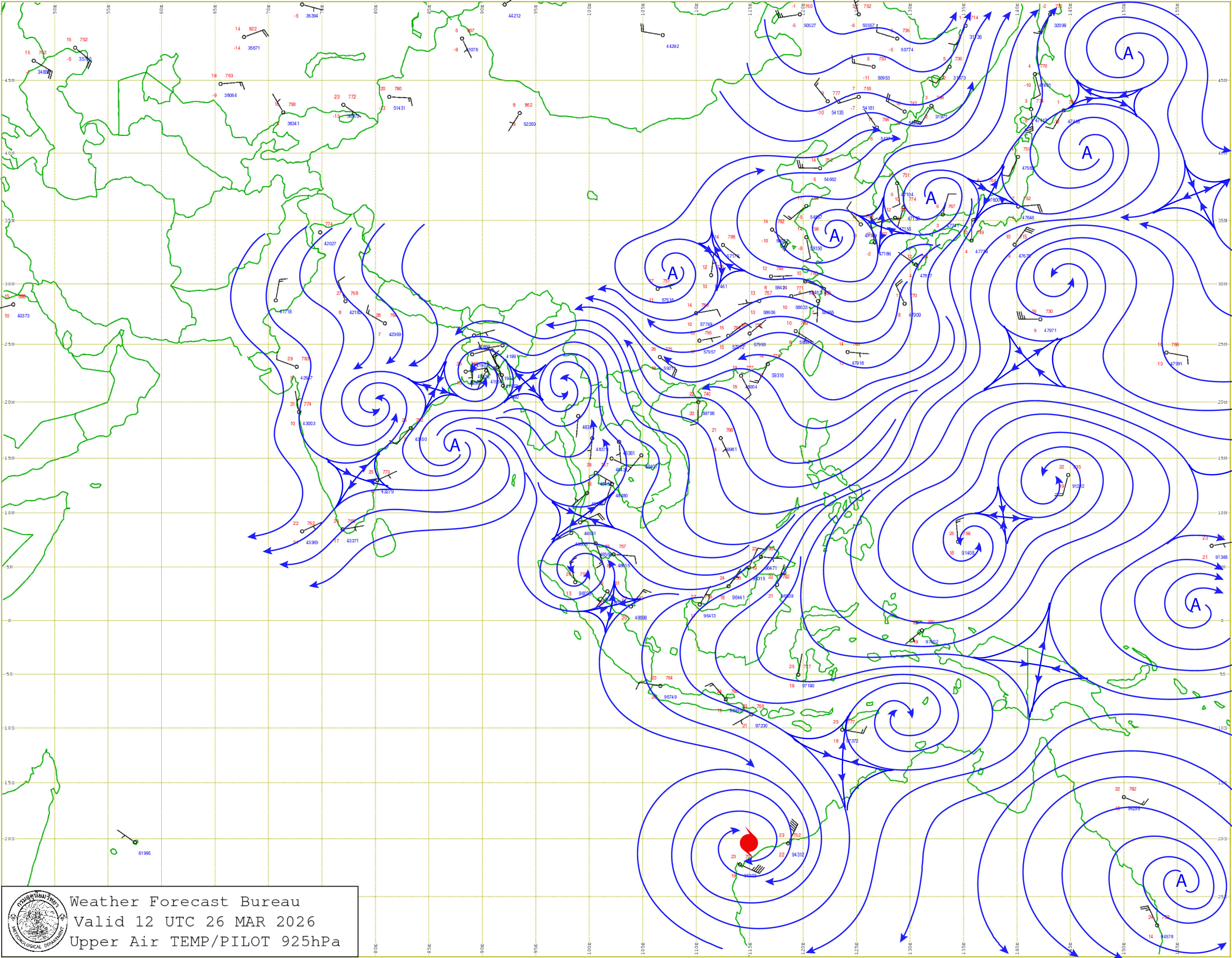 กรุงเทพมหานครและปริมณฑล : อากาศร้อนโดยทั่วไป กับมีฟ้าหลัวในตอนกลางวัน อุณหภูมิต่ำสุด 26-28 องศาเซลเซียส อุณหภูมิสูงสุด 35-39 องศาเซลเซียส ลมใต้ ความเร็ว 10-20 กม./ชม.
