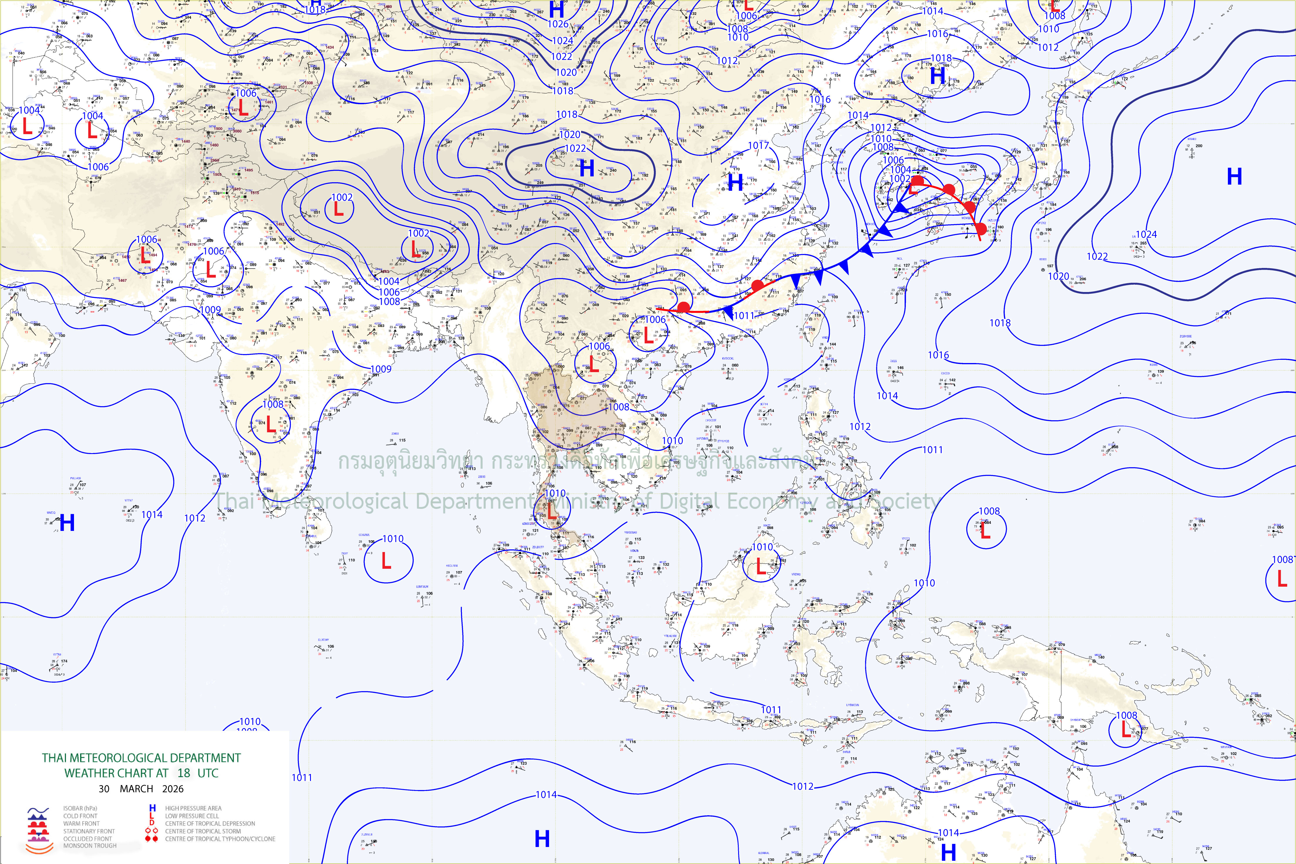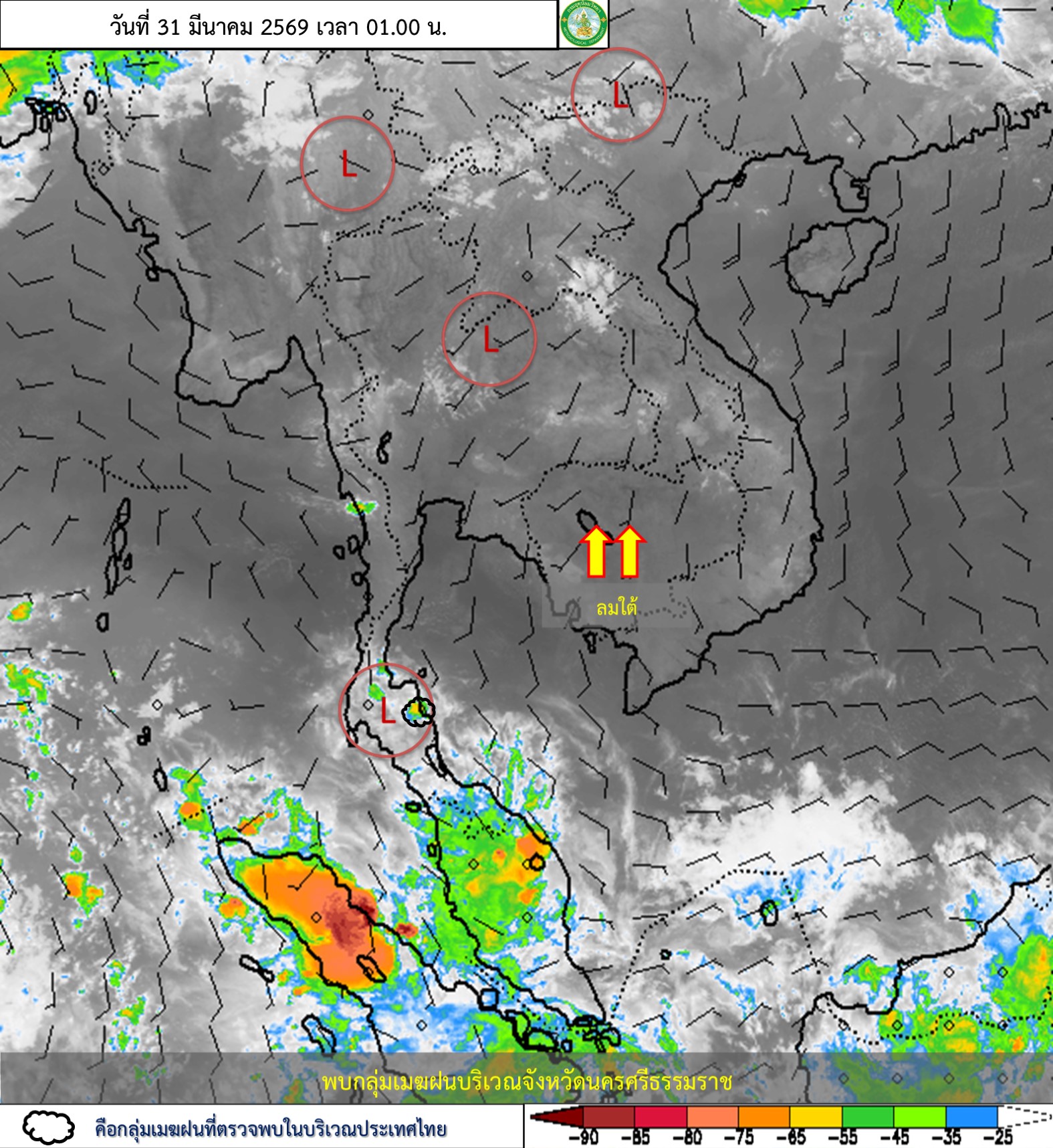 ลักษณะอากาศทั่วไป : พยากรณ์อากาศ 24 ชั่วโมงข้างหน้า ประเทศไทยตอนบนมีอากาศร้อนโดยทั่วไป กับมีฟ้าหลัวในตอนกลางวัน และมีอากาศร้อนจัดบางพื้นที่ในภาคเหนือ ภาคตะวันออกเฉียงเหนือ และภาคกลาง เนื่องจากความกดอากาศต่ำเนื่องจากความร้อนปกคลุมประเทศไทยตอนบน ในขณะที่ลมใต้และลมตะวันตกเฉียงใต้กำลังอ่อนพัดปกคลุม ทำให้บริเวณดังกล่าวมีฝนฟ้าคะนองกับมีลมกระโชกแรงบางแห่ง ขอให้ประชาชนบริเวณประเทศไทยดูแลรักษาสุขภาพเนื่องจากสภาพอากาศที่ร้อนถึงร้อนจัด โดยหลีกเลี่ยงการทำงานหรือการประกอบกิจกรรมในที่โล่งแจ้งเป็นระยะเวลานาน รวมทั้งระวังอันตรายจากฝนฟ้าคะนองและลมกระโชกแรงที่อาจเกิดขึ้นในบางพื้นที่ไว้ด้วย