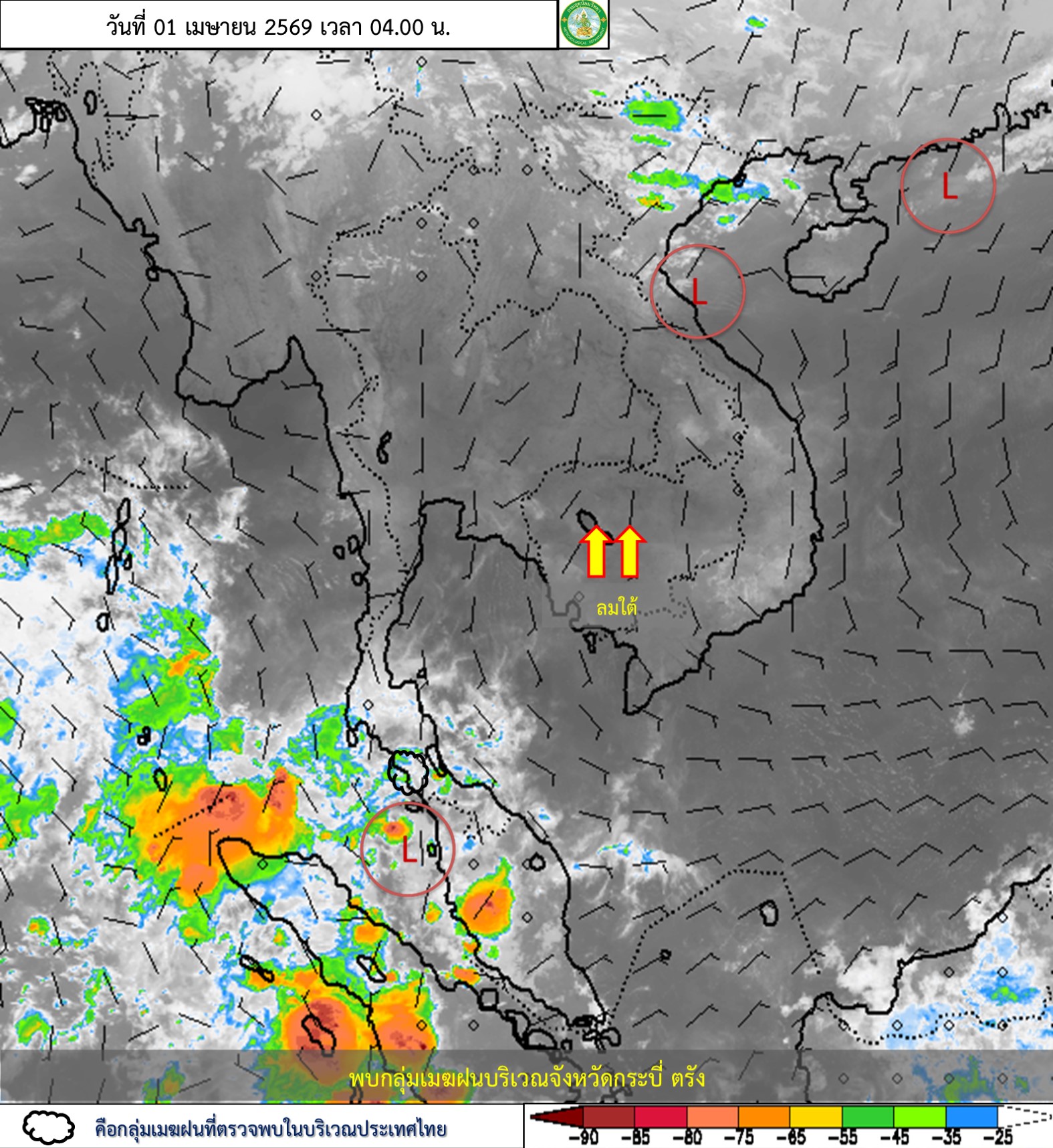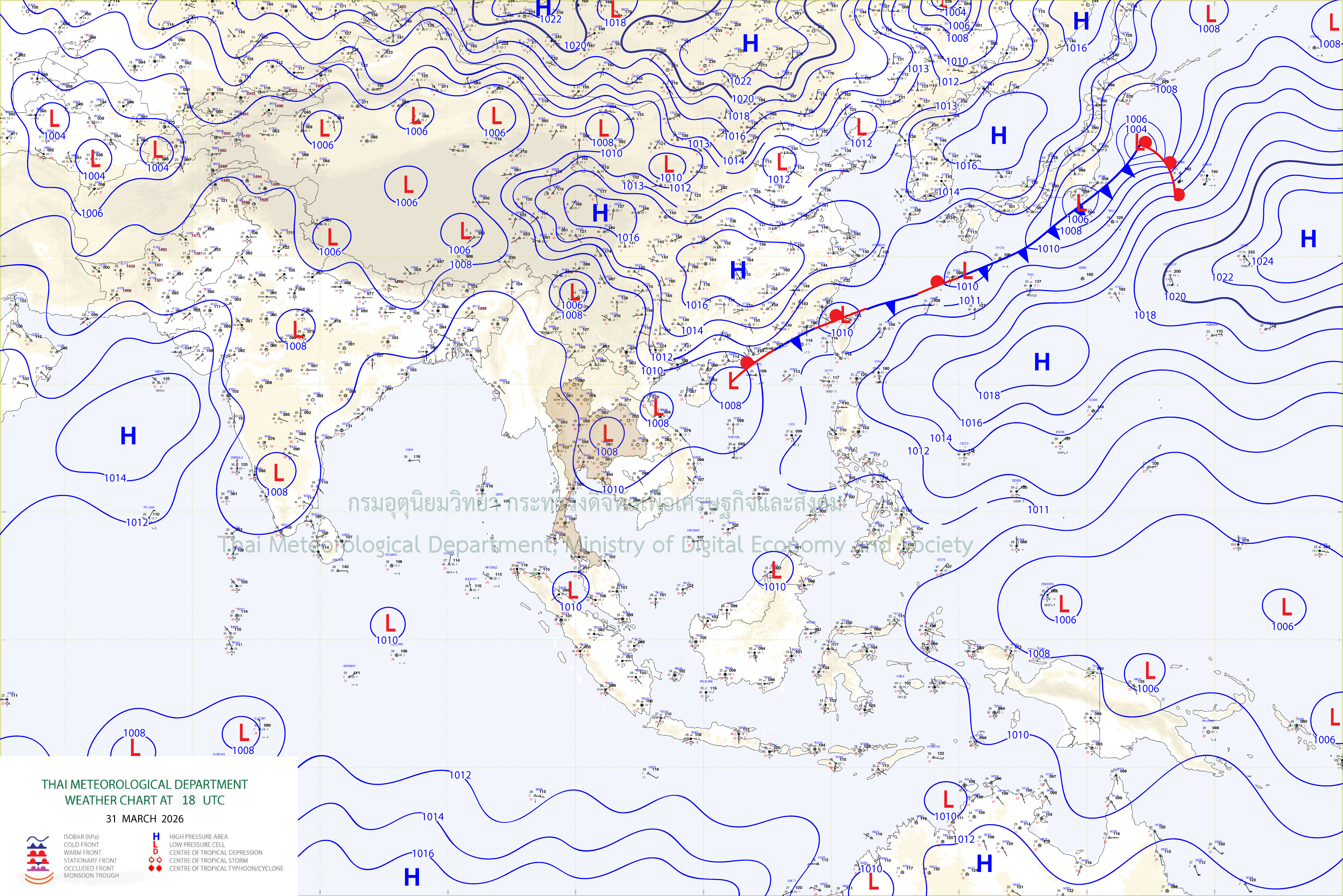 ลักษณะอากาศทั่วไป : พยากรณ์อากาศ 24 ชั่วโมงข้างหน้า ประเทศไทยตอนบนมีอากาศร้อนโดยทั่วไป กับมีฟ้าหลัวในตอนกลางวัน และมีอากาศร้อนจัดบางพื้นที่ในภาคเหนือ ภาคตะวันออกเฉียงเหนือ และภาคกลาง เนื่องจากความกดอากาศต่ำเนื่องจากความร้อนปกคลุมประเทศไทยตอนบน ในขณะที่มีลมใต้และลมตะวันตกเฉียงใต้กำลังอ่อนพัดปกคลุม ทำให้บริเวณดังกล่าวมีฝนฟ้าคะนองกับมีลมกระโชกแรงบางแห่ง ขอให้ ประชาชนบริเวณประเทศไทยดูแลรักษาสุขภาพเนื่องจากสภาพอากาศที่ร้อนถึงร้อนจัด โดยหลีกเลี่ยงการทำงานหรือการประกอบกิจกรรมในที่โล่งแจ้งเป็นระยะเวลานาน รวมทั้งระวังอันตรายจากฝนฟ้าคะนองและลมกระโชกแรงที่อาจเกิดขึ้นในบางพื้นที่ไว้ด้วย สำหรับภาคใต้มีฝนฟ้าคะนองบางแห่ง โดยมีอากาศร้อนในตอนกลางวัน เนื่องจากลมตะวันออกและลมตะวันออกเฉียงใต้พัดปกคลุมอ่าวไทย ภาคใต้ และทะเลอันดามัน