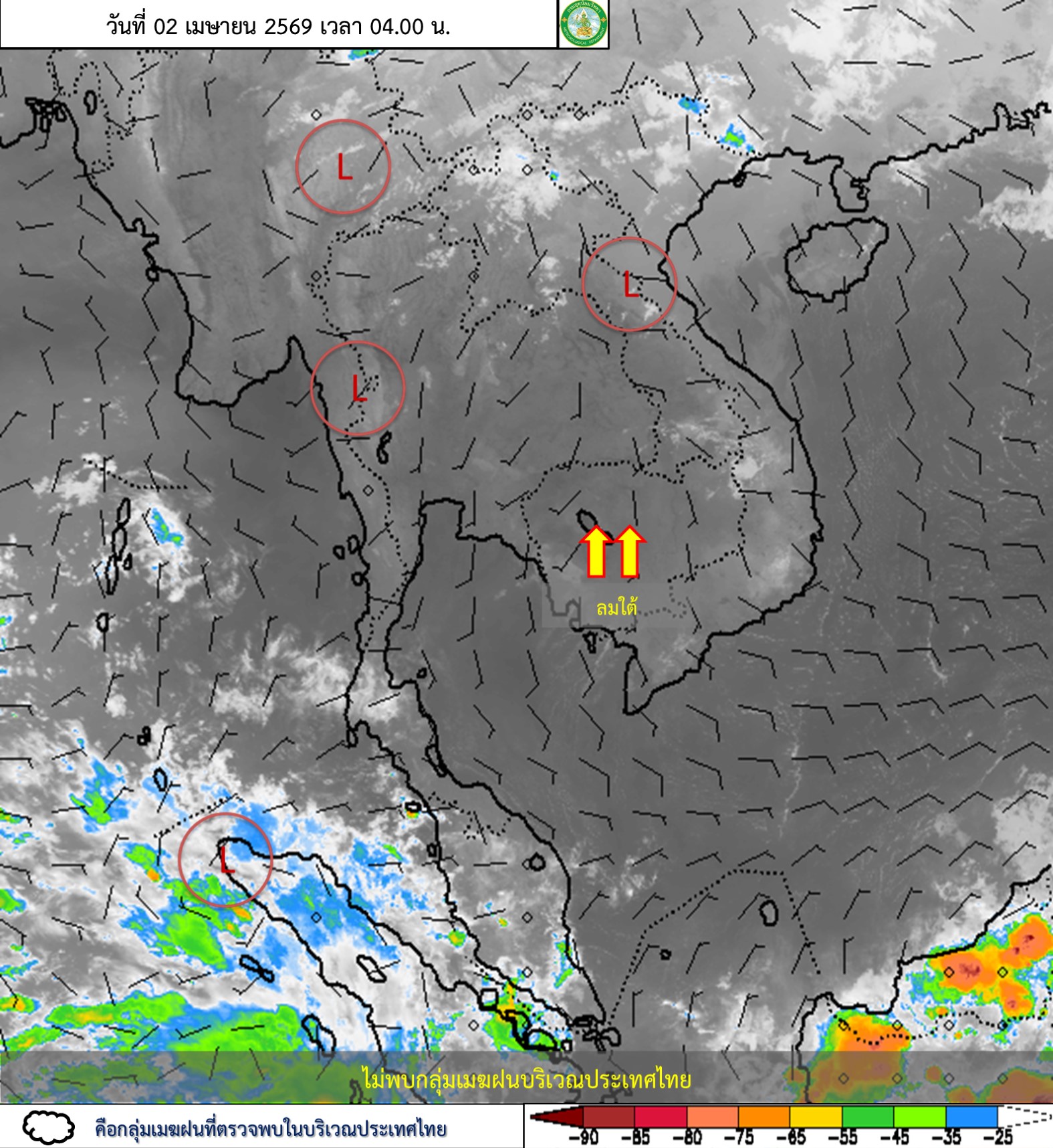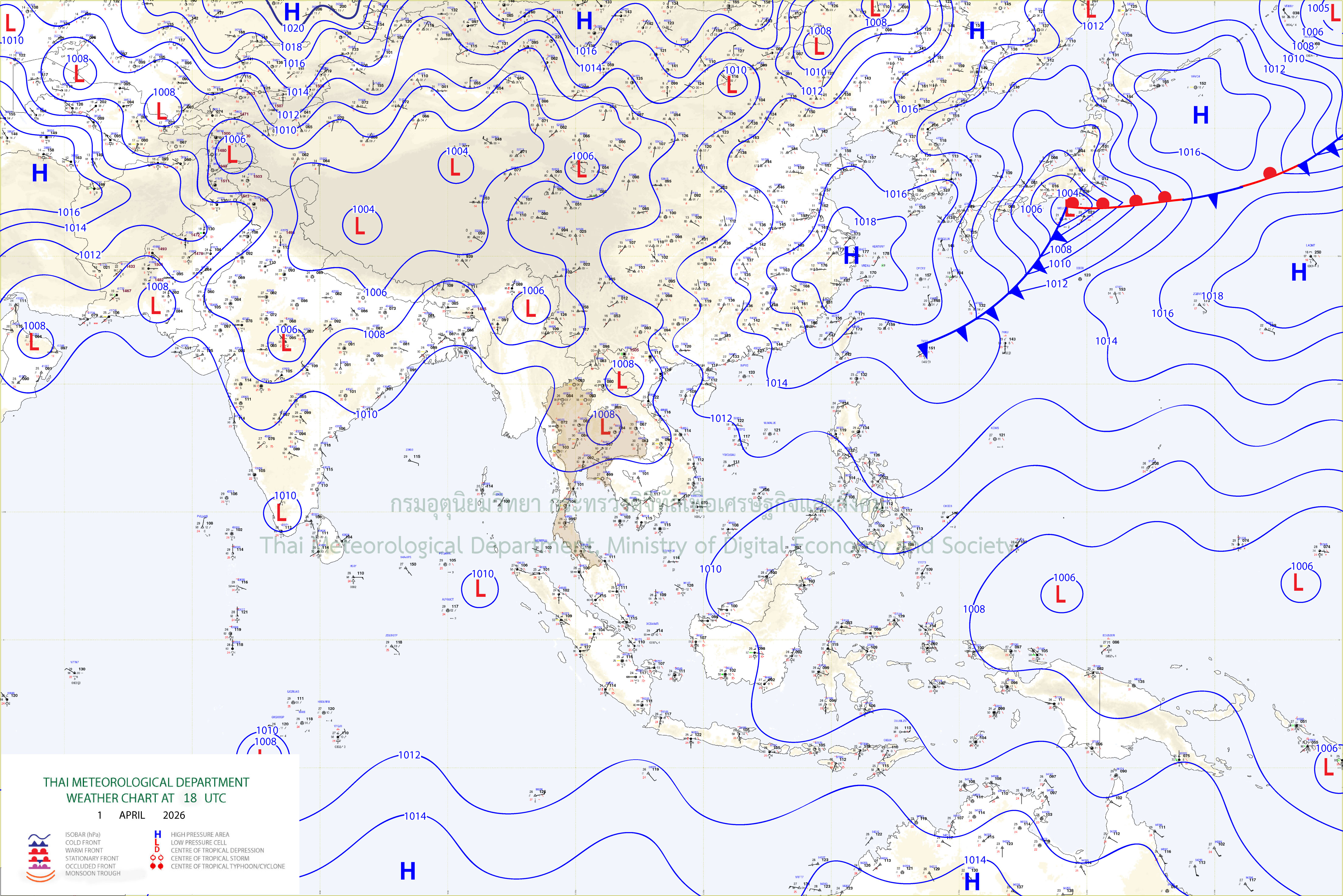 ลักษณะอากาศทั่วไป : พยากรณ์อากาศ 24 ชั่วโมงข้างหน้า ประเทศไทยตอนบนมีอากาศร้อนโดยทั่วไป กับมีฟ้าหลัวในตอนกลางวัน และมีอากาศร้อนจัดบางพื้นที่ในภาคเหนือ ภาคตะวันออกเฉียงเหนือ และภาคกลาง เนื่องจากความกดอากาศต่ำเนื่องจากความร้อนปกคลุมประเทศไทยตอนบน ในขณะที่มีลมใต้และลมตะวันตกเฉียงใต้พัดปกคลุม ทำให้บริเวณดังกล่าวมีฝนฟ้าคะนองกับมีลมกระโชกแรงบางแห่ง ขอให้ประชาชนบริเวณประเทศไทยดูแลรักษาสุขภาพเนื่องจากสภาพอากาศที่ร้อนถึงร้อนจัด โดยหลีกเลี่ยงการทำงานหรือการประกอบกิจกรรมในที่โล่งแจ้งเป็นระยะเวลานาน รวมทั้งระวังอันตรายจากฝนฟ้าคะนองและลมกระโชกแรงที่อาจเกิดขึ้นในบางพื้นที่ไว้ด้วย สำหรับภาคใต้มีฝนน้อยแต่ยังคงมีฝนฟ้าคะนองบางแห่ง โดยมีอากาศร้อนในตอนกลางวัน เนื่องจากลมตะวันออกและลมตะวันออกเฉียงใต้พัดปกคลุมอ่าวไทย ภาคใต้ และทะเลอันดามันมีกำลังอ่อนลง