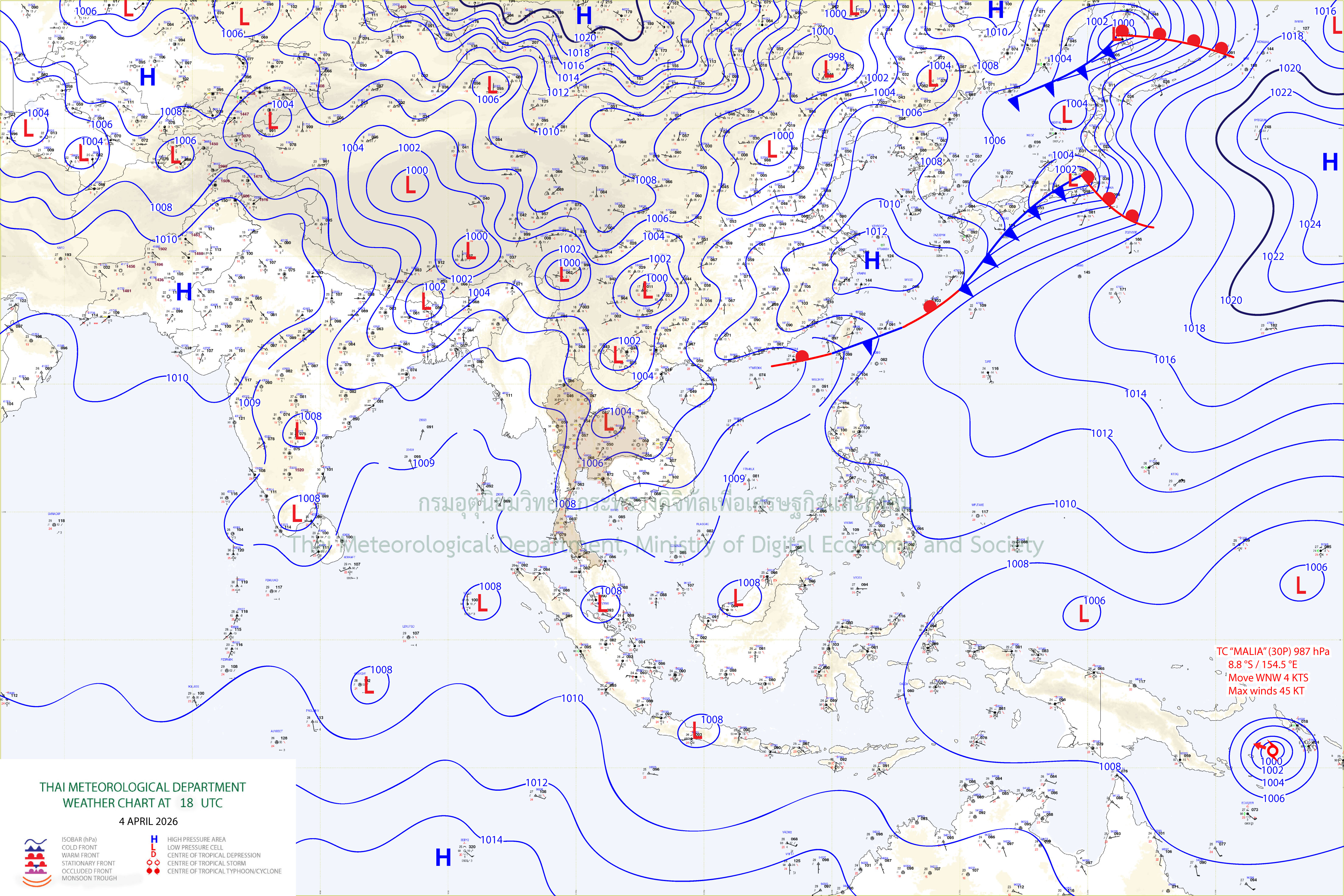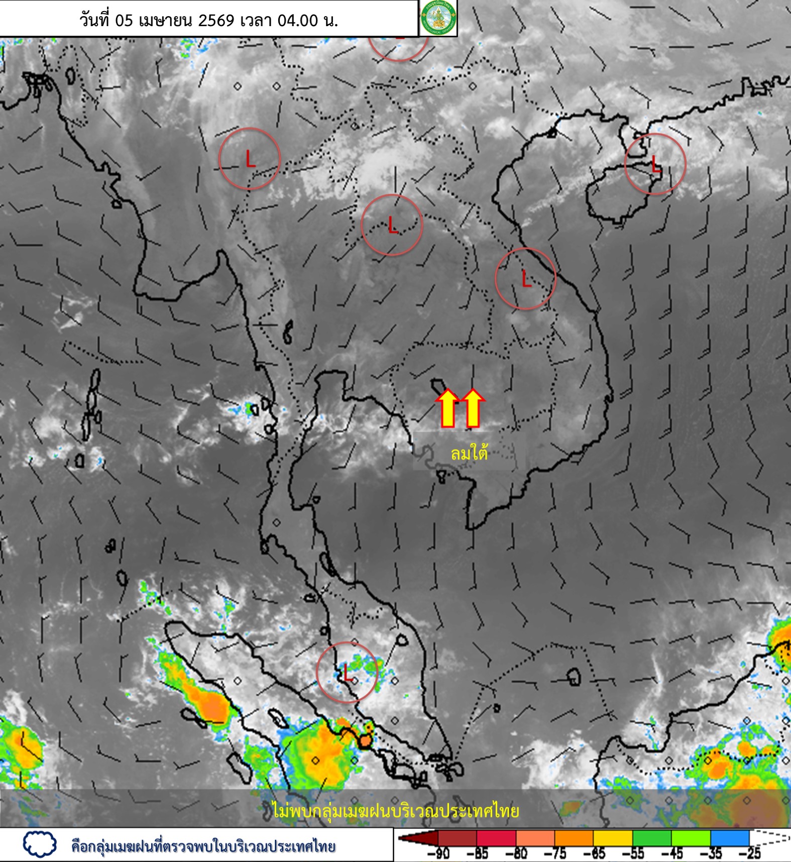 ลักษณะอากาศทั่วไป : พยากรณ์อากาศ 24 ชั่วโมงข้างหน้า ประเทศไทยตอนบนมีอากาศร้อนโดยทั่วไปและมีอากาศร้อนจัดบางพื้นที่ กับมีฟ้าหลัวในตอนกลางวัน ส่วนภาคใต้มีอากาศร้อน เนื่องจากความกดอากาศต่ำเนื่องจากความร้อนปกคลุมประเทศไทยตอนบน ในขณะที่มีลมใต้และลมตะวันตกเฉียงใต้กำลังอ่อนพัดปกคลุมในบริเวณดังกล่าว ทำให้ประเทศไทยมีฝนน้อย ขอให้ประชาชน ดูแลรักษาสุขภาพเนื่องจากสภาพอากาศที่ร้อนถึงร้อนจัด โดยหลีกเลี่ยงการทำงานหรือการประกอบกิจกรรมในที่โล่งแจ้งเป็นระยะเวลานาน รวมทั้งระวังอันตรายจากฝนฟ้าคะนองที่อาจเกิดขึ้นได้บางพื้นที่ไว้ด้วย