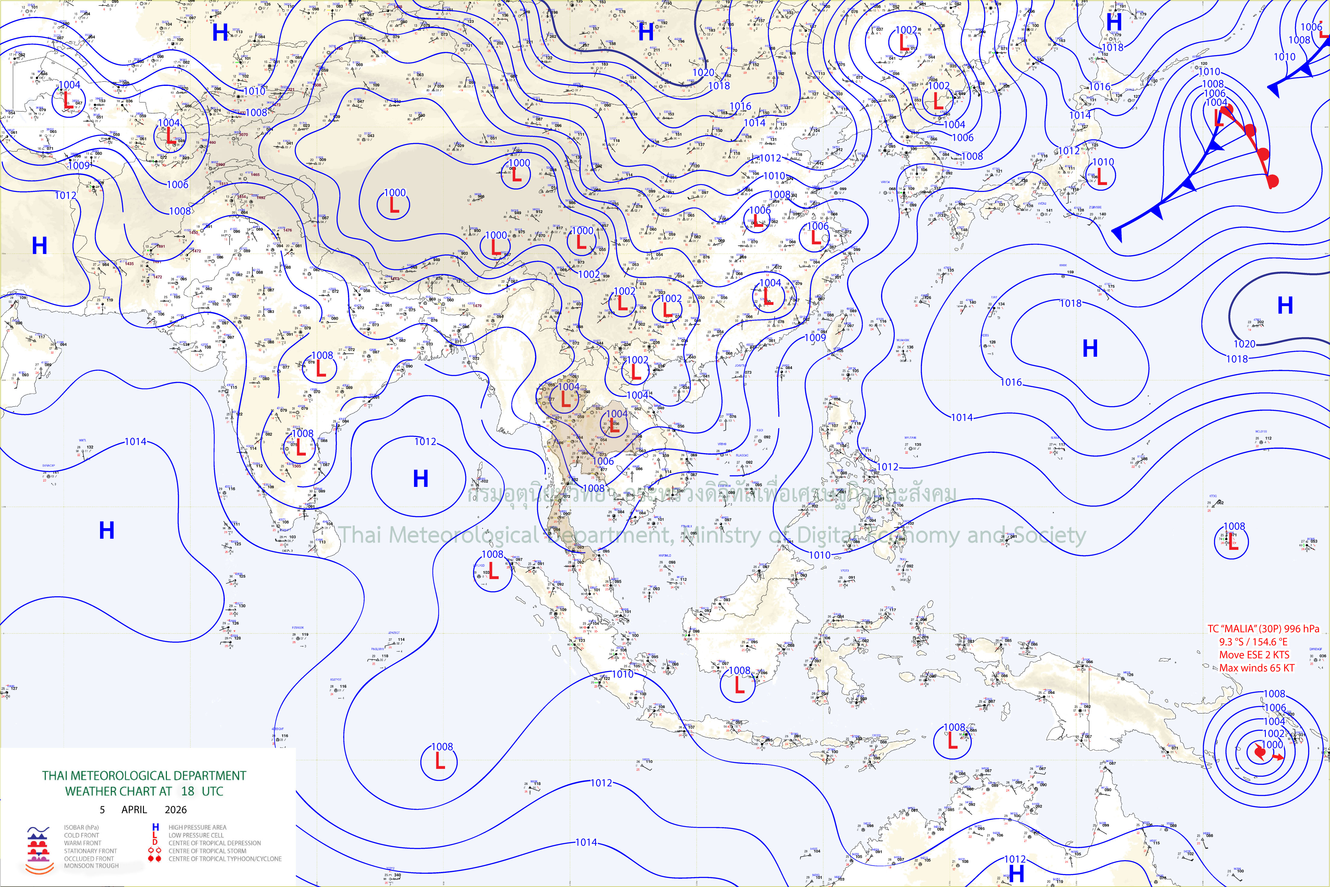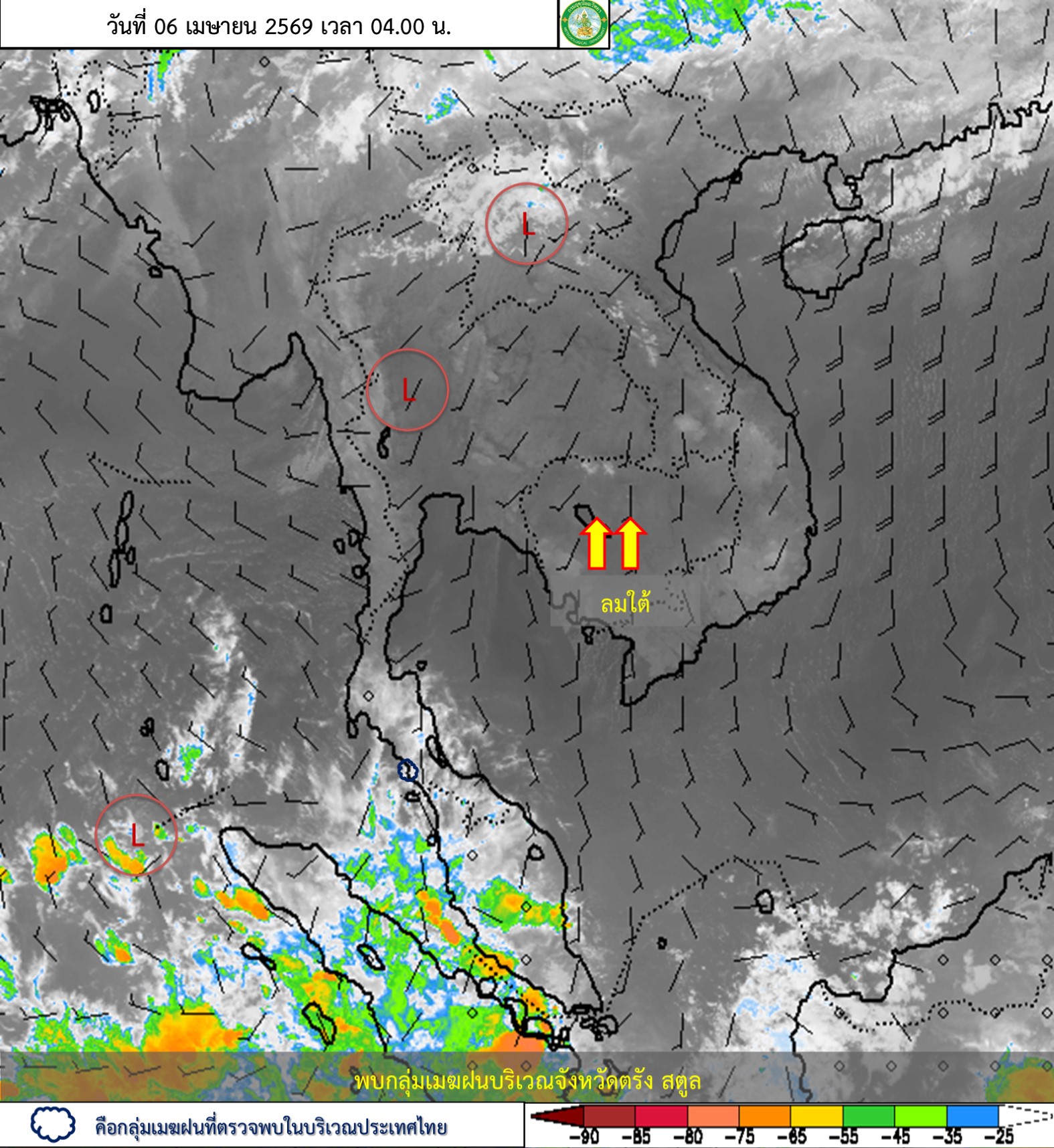 ลักษณะอากาศทั่วไป : พยากรณ์อากาศ 24 ชั่วโมงข้างหน้า ประเทศไทยตอนบนมีอากาศร้อนโดยทั่วไปและมีอากาศร้อนจัดบางพื้นที่ กับมีฟ้าหลัวในตอนกลางวัน ส่วนภาคใต้มีอากาศร้อน เนื่องจากความกดอากาศต่ำเนื่องจากความร้อนปกคลุมประเทศไทยตอนบน ในขณะที่มีลมใต้และลมตะวันตกเฉียงใต้กำลังอ่อนพัดปกคลุมในบริเวณดังกล่าว ทำให้ประเทศไทยมีฝนน้อย ขอให้ประชาชน ดูแลรักษาสุขภาพเนื่องจากสภาพอากาศที่ร้อนถึงร้อนจัด โดยหลีกเลี่ยงการทำงานหรือการประกอบกิจกรรมในที่โล่งแจ้งเป็นระยะเวลานาน รวมทั้งระวังอันตรายจากฝนฟ้าคะนองที่อาจเกิดขึ้นได้บางพื้นที่ไว้ด้วย