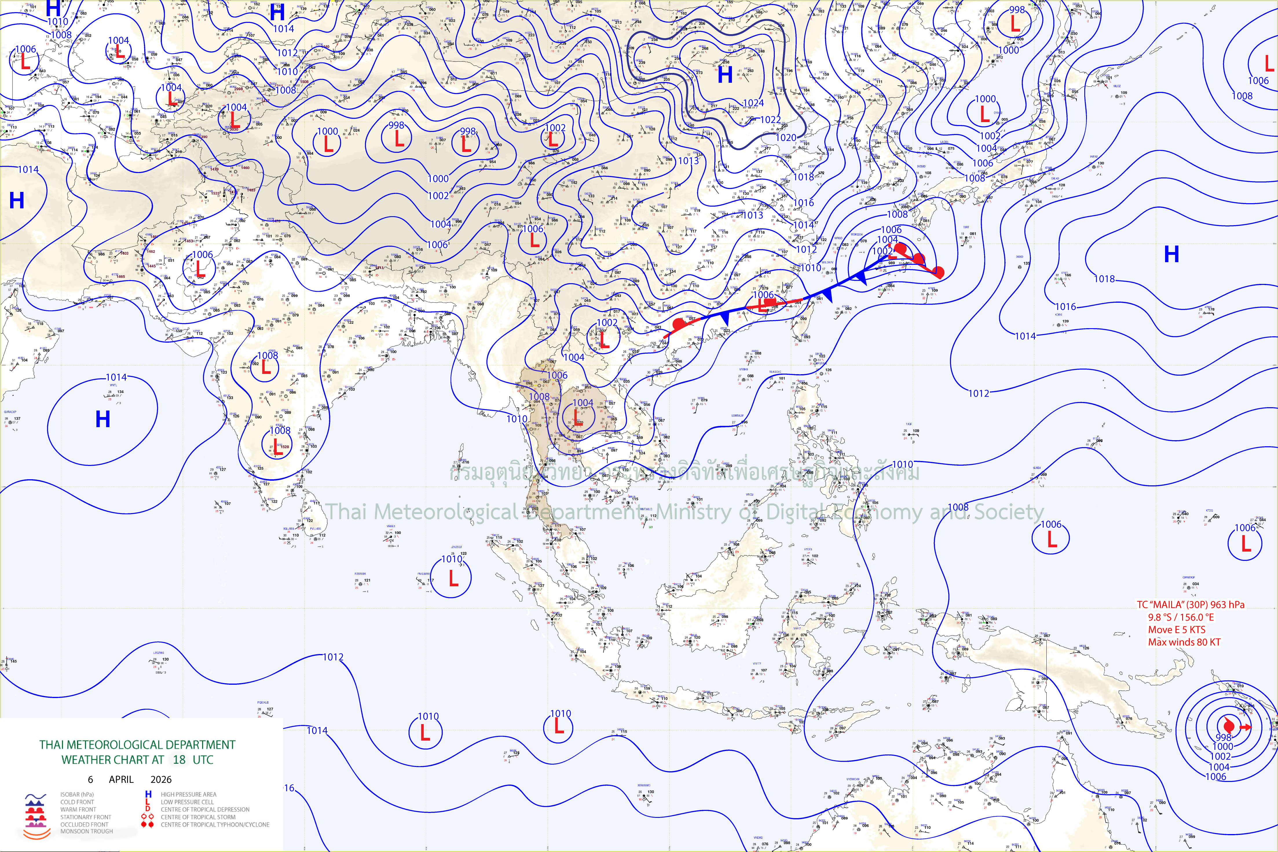 ลักษณะอากาศทั่วไป : พยากรณ์อากาศ 24 ชั่วโมงข้างหน้า ประเทศไทยตอนบนมีอากาศร้อนโดยทั่วไปกับมีฟ้าหลัวในตอนกลางวัน และมีอากาศร้อนจัดบางพื้นที่ในภาคเหนือ ภาคตะวันออกเฉียงเหนือ และภาคกลาง เนื่องจากความกดอากาศต่ำเนื่องจากความร้อนปกคลุมประเทศไทยตอนบน ในขณะที่มีลมใต้ และลมตะวันตกเฉียงใต้กำลังอ่อนพัดปกคลุมในบริเวณดังกล่าว ทำให้ประเทศไทยตอนบนมีฝนฟ้าคะนองเล็กน้อยบางแห่ง ขอให้ประชาชนดูแลรักษาสุขภาพเนื่องจากสภาพอากาศที่ร้อนถึงร้อนจัด โดยหลีกเลี่ยงการทำงานหรือการประกอบกิจกรรมในที่โล่งแจ้งเป็นระยะเวลานาน รวมทั้งระวังอันตรายจากฝนฟ้าคะนองที่อาจเกิดขึ้นได้บางพื้นที่ไว้ด้วย สำหรับภาคใต้มีฝนฟ้าคะนอง กับลมกระโชกแรงบางแห่ง โดยมีอากาศร้อนในตอนกลางวัน เนื่องจากลมฝ่ายตะวันตกพัดปกคลุมทะเลอันดามัน ภาคใต้ และอ่าวไทยตอนบน ประกอบกับมีลมตะวันออกเฉียงใต้พัดปกคลุมอ่าวไทยตอนล่าง ขอให้ประชาชนในบริเวณดังกล่าวระวังอันตรายจากฝนฟ้าคะนอง และลมกระโชกแรงที่อาจเกิดขึ้นในบางพื้นที่ ส่วนคลื่นลมบริเวณอ่าวไทยและทะเลอันดามันมีกำลังอ่อน โดยมีคลื่นสูงประมาณ 1 เมตร บริเวณที่มีฝนฟ้าคะนองคลื่นสูงมากกว่า 1 เมตร ขอให้ชาวเรือหลีกเลี่ยงการเดินเรือในบริเวณที่มีฝนฟ้าคะนองไว้ด้วย