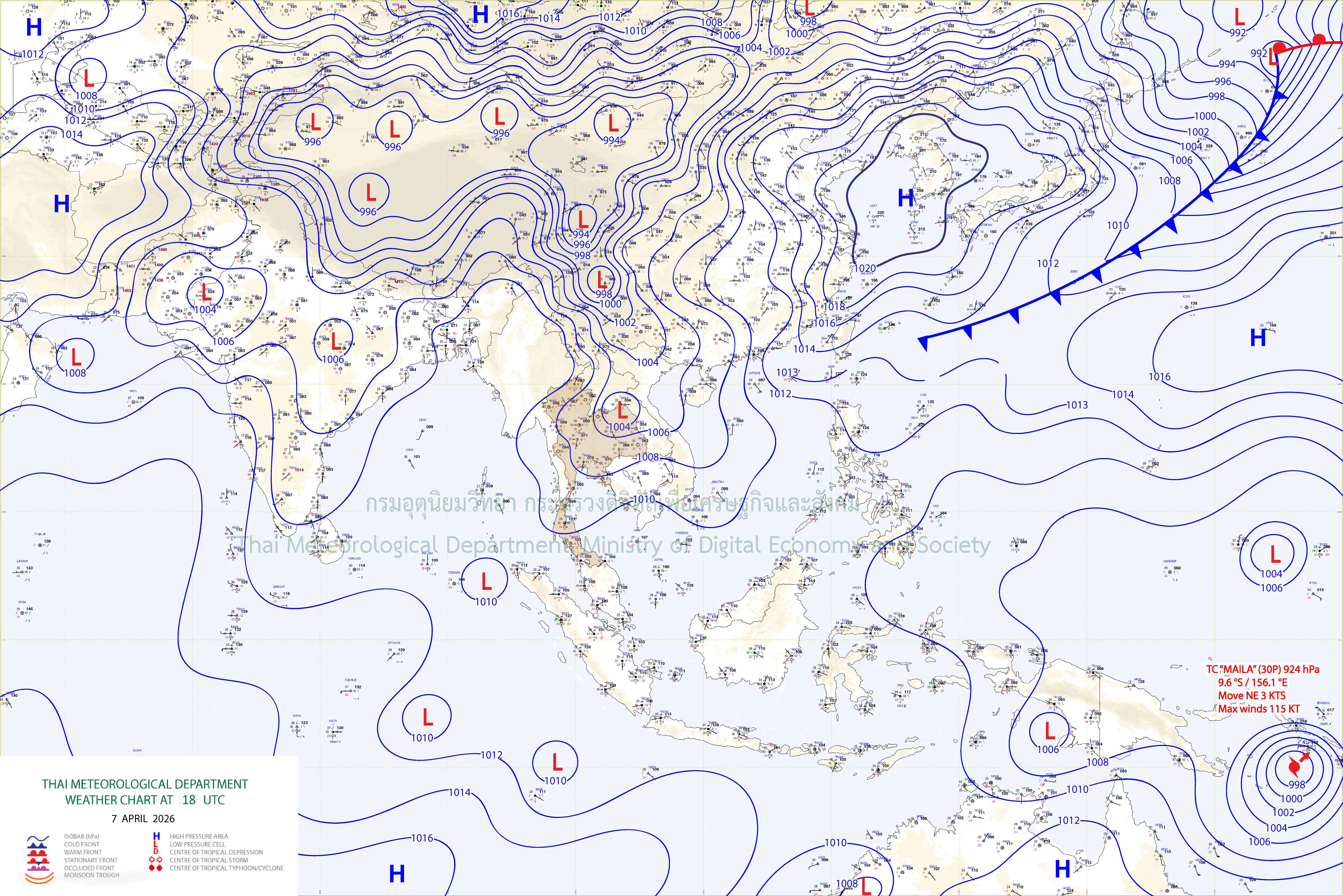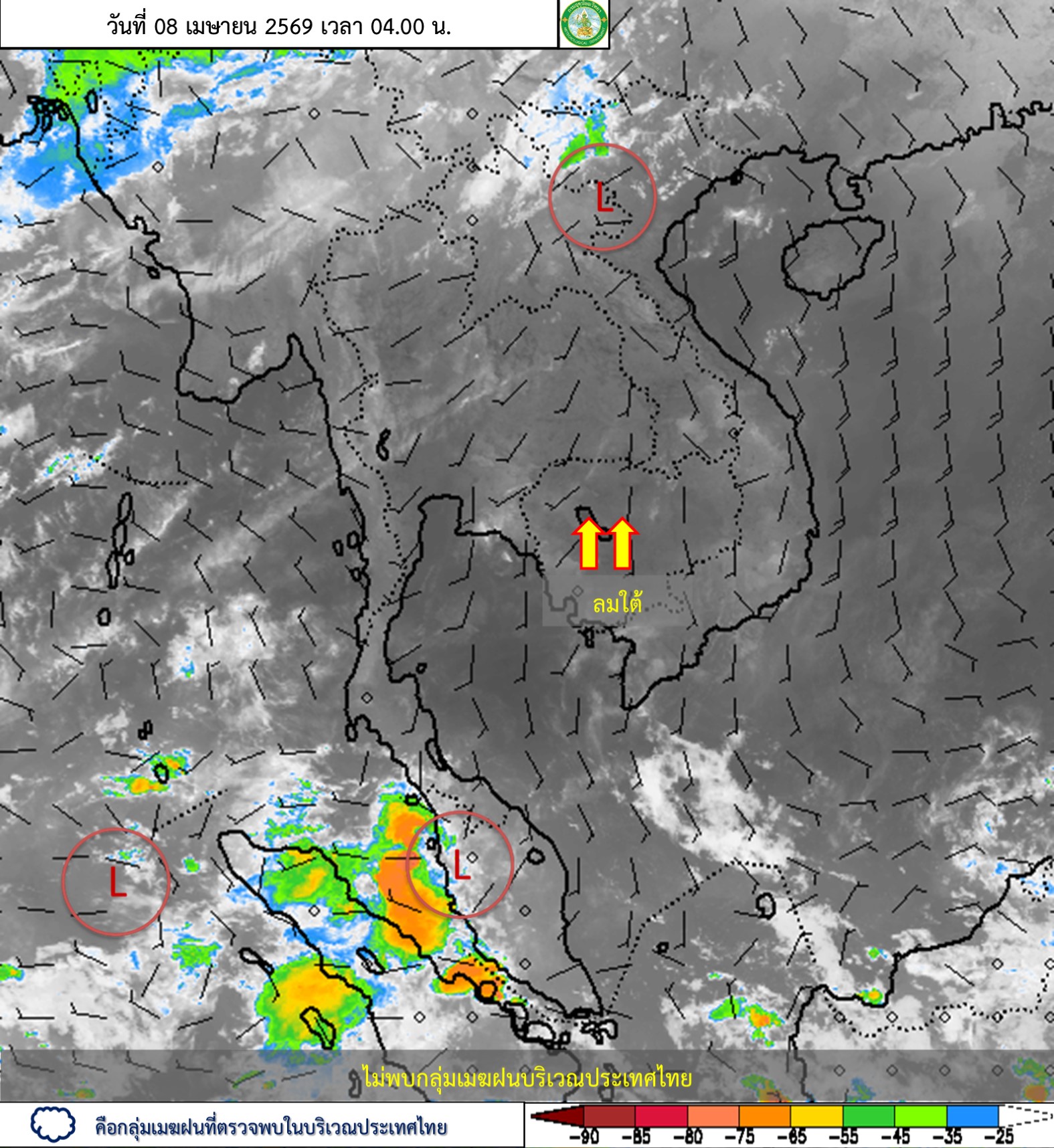 ลักษณะอากาศทั่วไป : พยากรณ์อากาศ 24 ชั่วโมงข้างหน้า ประเทศไทยตอนบนมีอากาศร้อนโดยทั่วไปและมีอากาศร้อนจัดบางพื้นที่ กับมีฟ้าหลัวในตอนกลางวัน เนื่องจากความกดอากาศต่ำ เนื่องจากความร้อนปกคลุมประเทศไทยตอนบน ในขณะที่มีลมใต้ และลมตะวันตกเฉียงใต้กำลังอ่อนพัดปกคลุมในบริเวณดังกล่าว ทำให้ประเทศไทยตอนบนมีฝนฟ้าคะนองเล็กน้อยบางพื้นที่ กับมีลมกระโชกแรงบางแห่ง ส่วนมากทางภาคเหนือ ขอให้ประชาชนดูแลรักษาสุขภาพเนื่องจากสภาพอากาศที่ร้อนถึงร้อนจัด โดยหลีกเลี่ยงการทำงานหรือการประกอบกิจกรรมในที่โล่งแจ้งเป็นระยะเวลานาน รวมทั้งระวังอันตรายจากฝนฟ้าคะนองที่อาจเกิดขึ้นได้บางพื้นที่ไว้ด้วย