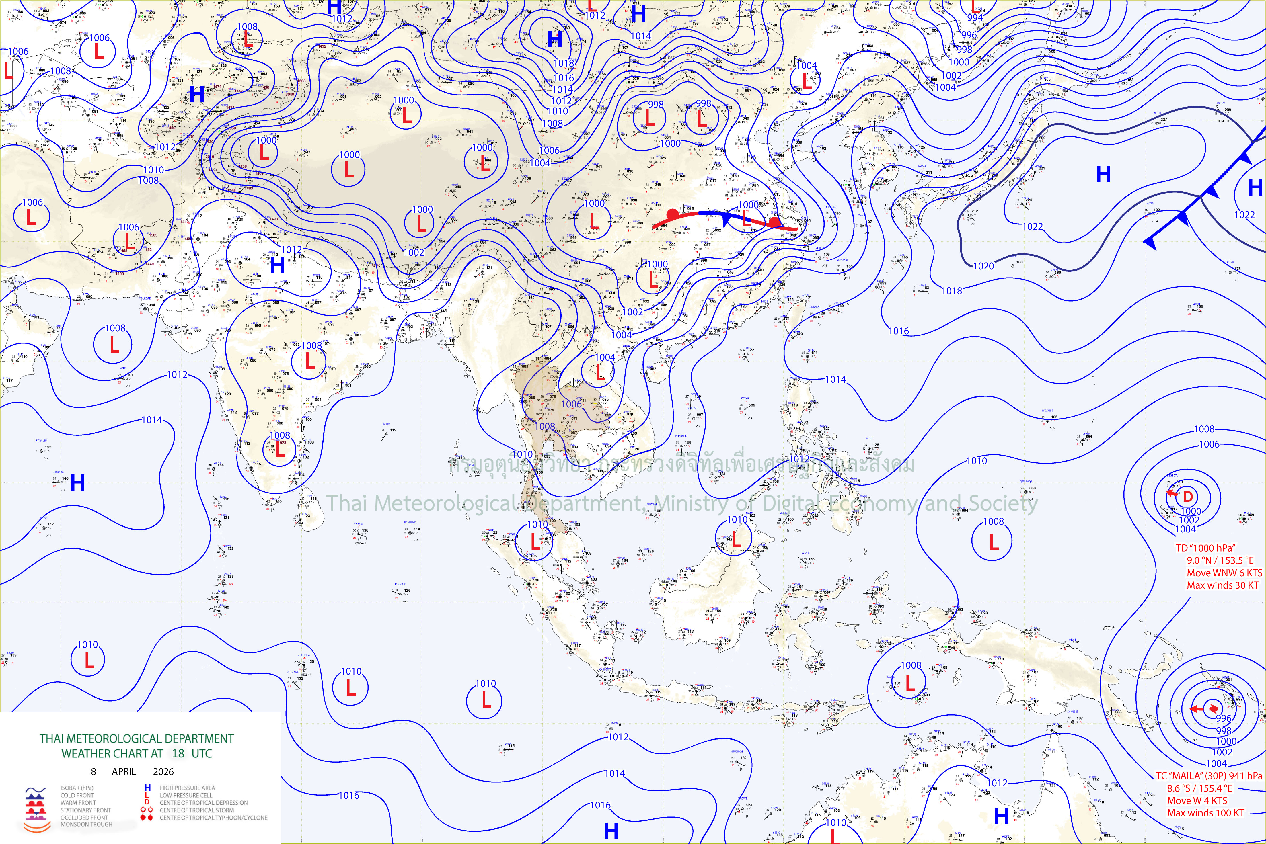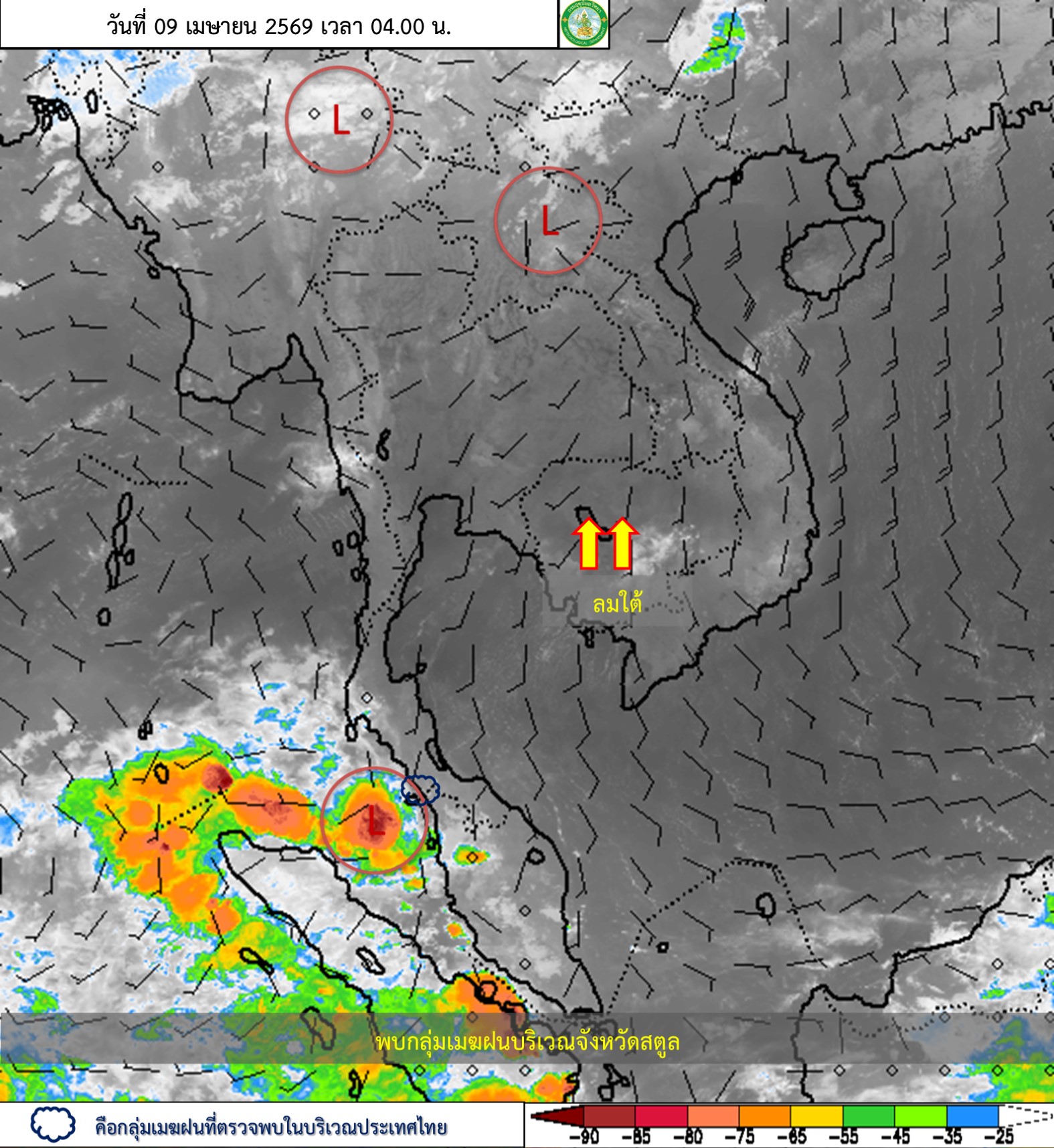ลักษณะอากาศทั่วไป : พยากรณ์อากาศ 24 ชั่วโมงข้างหน้า ประเทศไทยตอนบนมีอากาศร้อนโดยทั่วไปและมีอากาศร้อนจัดบางพื้นที่ กับมีฟ้าหลัวในตอนกลางวัน เนื่องจากความกดอากาศต่ำ เนื่องจากความร้อนปกคลุมประเทศไทยตอนบน ในขณะที่มีลมใต้ และลมตะวันตกเฉียงใต้กำลังอ่อนพัดปกคลุมในบริเวณดังกล่าว ทำให้ประเทศไทยตอนบนมีฝนฟ้าคะนองกับมีลมกระโชกแรงบางแห่ง ขอให้ประชาชนดูแลรักษาสุขภาพเนื่องจากสภาพอากาศที่ร้อนถึงร้อนจัด โดยหลีกเลี่ยงการทำงานหรือการประกอบกิจกรรมในที่โล่งแจ้งเป็นระยะเวลานาน รวมทั้งระวังอันตรายจากฝนฟ้าคะนองที่อาจเกิดขึ้นได้บางพื้นที่ไว้ด้วย สำหรับภาคใต้มีฝนฟ้าคะนอง กับลมกระโชกแรงบางแห่ง โดยมีอากาศร้อนในตอนกลางวัน เนื่องจากลมฝ่ายตะวันตกพัดปกคลุมทะเลอันดามัน ภาคใต้ และอ่าวไทยตอนบน ประกอบกับมีลมตะวันออกเฉียงใต้พัดปกคลุมอ่าวไทยตอนล่าง ขอให้ประชาชนในบริเวณดังกล่าวระวังอันตรายจากฝนฟ้าคะนอง และลมกระโชกแรงที่อาจเกิดขึ้นในบางพื้นที่
