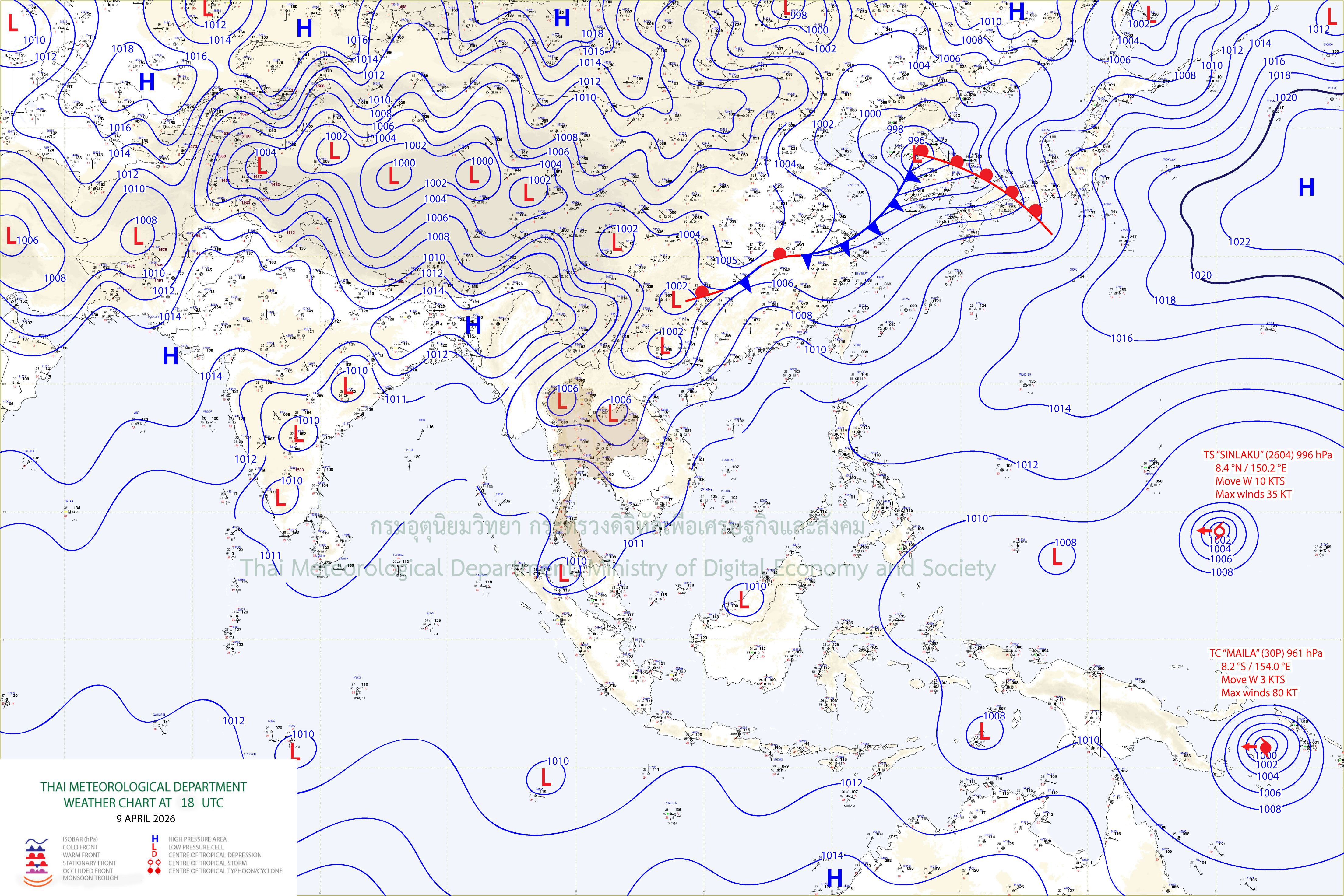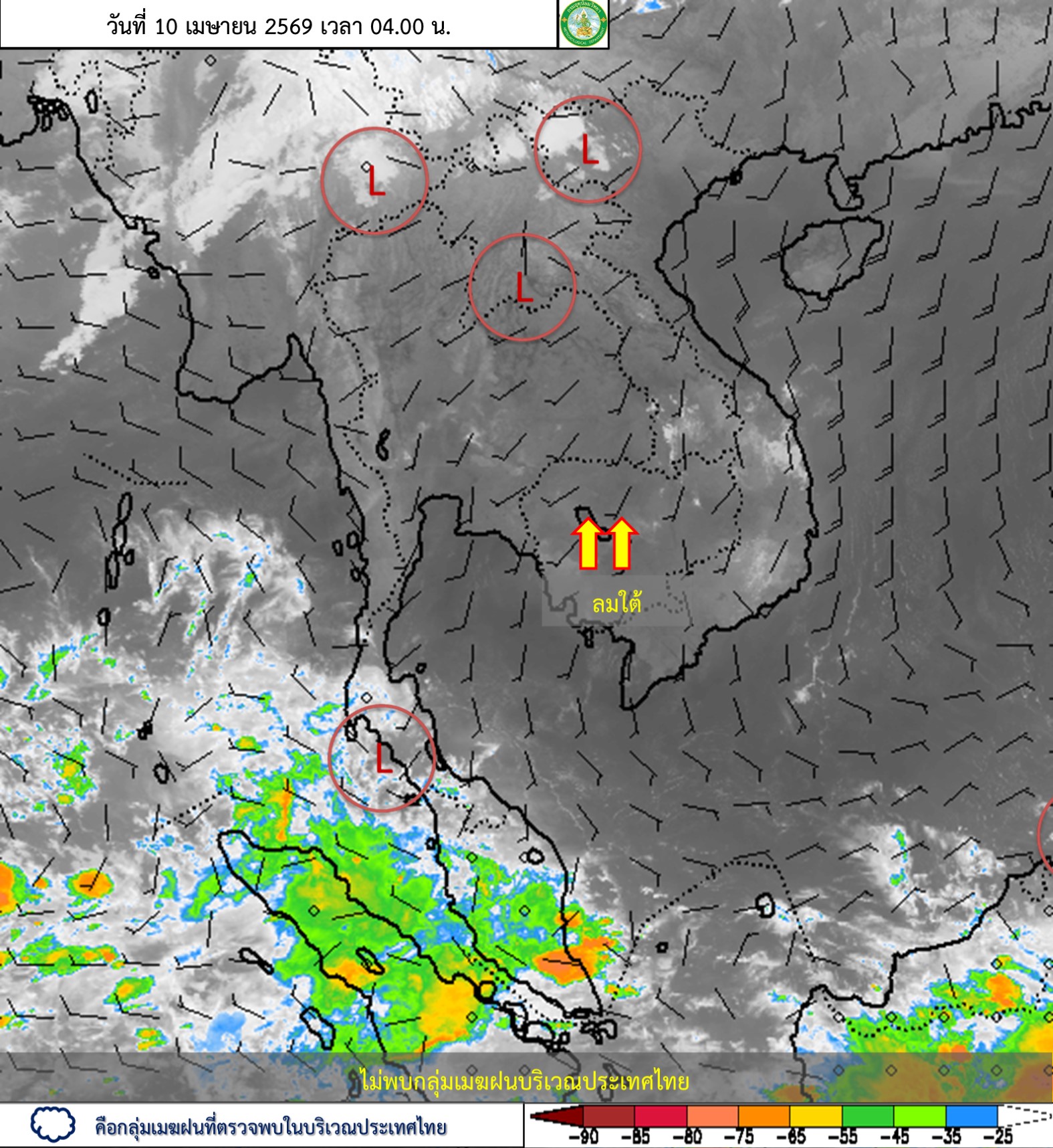 ลักษณะอากาศทั่วไป : พยากรณ์อากาศ 24 ชั่วโมงข้างหน้า ประเทศไทยตอนบนมีอากาศร้อนโดยทั่วไปและมีอากาศร้อนจัดบางพื้นที่ กับมีฟ้าหลัวในตอนกลางวัน เนื่องจากความกดอากาศต่ำ เนื่องจากความร้อนปกคลุมประเทศไทยตอนบน ในขณะที่มีลมใต้ และลมตะวันตกเฉียงใต้กำลังอ่อนพัดปกคลุมในบริเวณดังกล่าว ทำให้ประเทศไทยตอนบนมีฝนฟ้าคะนองกับมีลมกระโชกแรงบางแห่ง ขอให้ประชาชนดูแลรักษาสุขภาพเนื่องจากสภาพอากาศที่ร้อนถึงร้อนจัด โดยหลีกเลี่ยงการทำงานหรือการประกอบกิจกรรมในที่โล่งแจ้งเป็นระยะเวลานาน รวมทั้งระวังอันตรายจากฝนฟ้าคะนองที่อาจเกิดขึ้นได้บางพื้นที่ไว้ด้วย สำหรับภาคใต้มีอากาศร้อนในตอนกลางวัน โดยมีฝนฟ้าคะนอง กับลมกระโชกแรงบางแห่ง และมีฝนตกหนักบางพื้นที่บริเวณภาคใต้ฝั่งตะวันตก เนื่องจากลมฝ่ายตะวันตกพัดปกคลุมทะเลอันดามัน ภาคใต้ และอ่าวไทยตอนบน ประกอบกับมีลมตะวันออกเฉียงใต้พัดปกคลุมอ่าวไทยตอนล่าง ขอให้ประชาชนในบริเวณดังกล่าวระวังอันตรายจากฝนฟ้าคะนอง และลมกระโชกแรงที่อาจเกิดขึ้นในบางพื้นที่