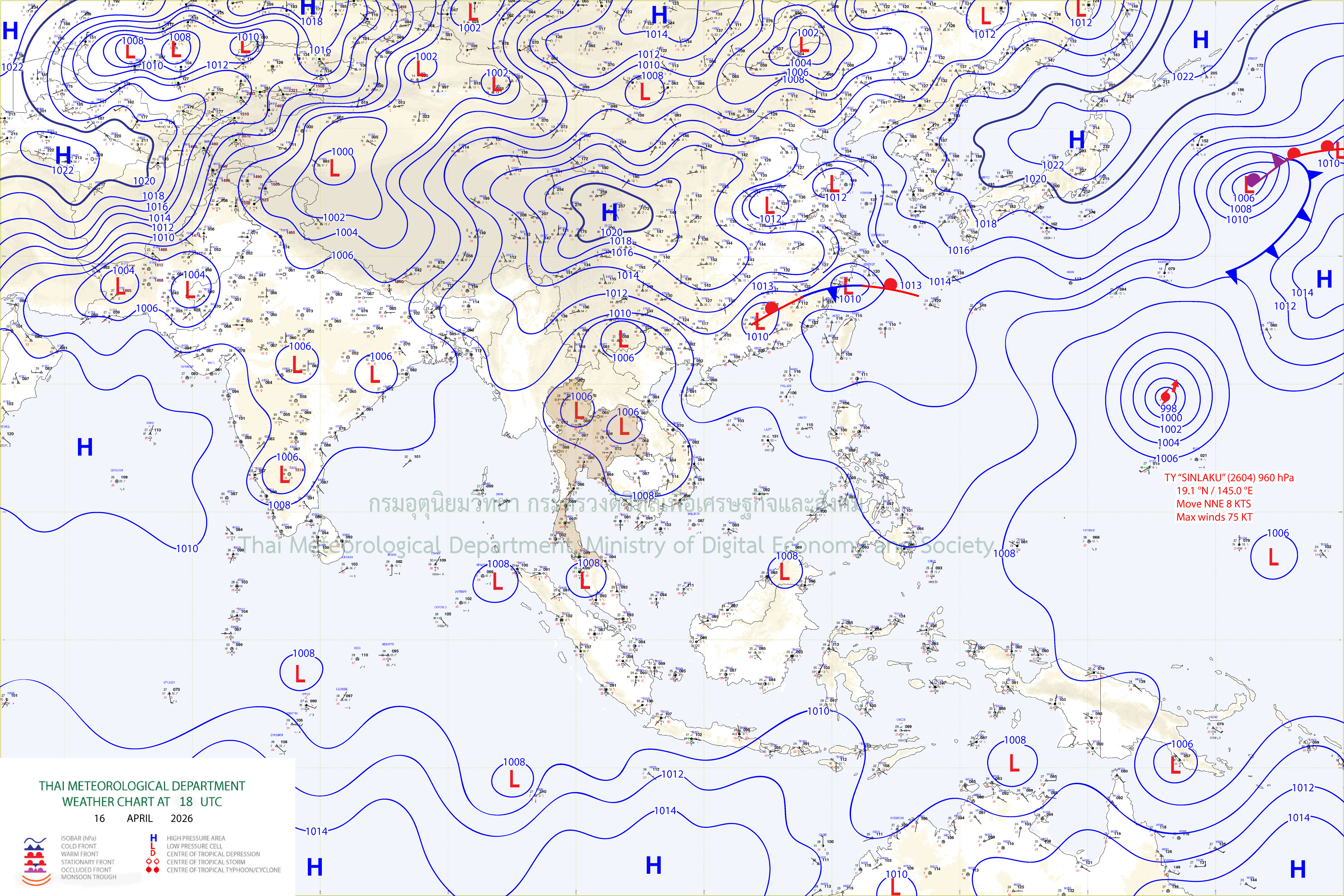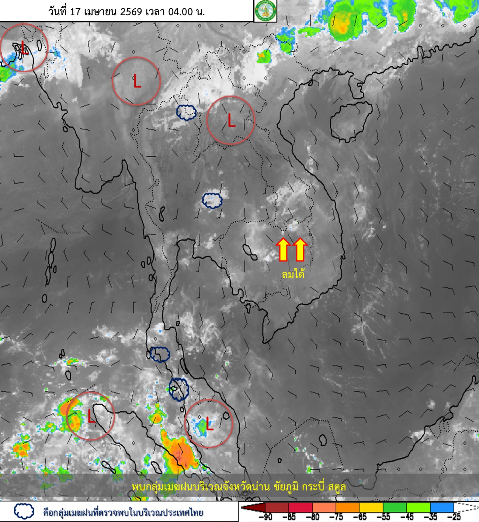 ลักษณะอากาศทั่วไป : พยากรณ์อากาศ 24 ชั่วโมงข้างหน้า บริเวณประเทศไทยตอนบนจะมีพายุฤดูร้อนเกิดขึ้น โดยมีลักษณะของพายุฝนฟ้าคะนอง ลมกระโชกแรง และลูกเห็บตกบางแห่ง รวมถึงอาจมีฟ้าผ่าเกิดขึ้นได้บางพื้นที่ เนื่องจากบริเวณความกดอากาศสูงหรือมวลอากาศเย็นได้แผ่ลงมาปกคลุมประเทศจีนตอนใต้ และทะเลจีนใต้แล้ว ส่งผลทำให้มีลมใต้และลมตะวันออกเฉียงใต้พัดนำความชื้นจากอ่าวไทยและทะเลจีนใต้เข้าปกคลุมภาคตะวันออกเฉียงเหนือตอนล่าง ภาคตะวันออก และอ่าวไทยตอนบน ในขณะที่บริเวณดังกล่าวมีอากาศร้อนถึงร้อนจัด ขอให้ประชาชนบริเวณภาคตะวันออกเฉียงเหนือตอนล่าง และภาคตะวันออกระวังอันตรายจากพายุฤดูร้อน โดยหลีกเลี่ยงการอยู่ในที่โล่งแจ้ง ใต้ต้นไม้ใหญ่ สิ่งปลูกสร้าง และป้ายโฆษณาที่ไม่แข็งแรง สำหรับเกษตรกรควรเสริมความแข็งแรงให้ไม้ผล และเตรียมการป้องกันความเสียหายที่อาจเกิดขึ้นกับผลผลิตทางการเกษตรและสัตว์เลี้ยง รวมทั้งดูแลรักษาสุขภาพในช่วงที่สภาพอากาศเปลี่ยนแปลงไว้ด้วย ส่วนประชาชนบริเวณประเทศไทยตอนบนดูแลรักษาสุขภาพเนื่องจากสภาพอากาศที่ร้อนถึงร้อนจัด โดยหลีกเลี่ยงการทำงานหรือการประกอบกิจกรรมในที่โล่งแจ้งเป็นระยะเวลานาน สำหรับภาคใต้มีอากาศร้อนในตอนกลางวัน โดยมีฝนฟ้าคะนองบางแห่ง เนื่องจากลมใต้และลมตะวันออกเฉียงใต้พัดปกคลุมอ่าวไทย ภาคใต้ และทะเลอันดามัน