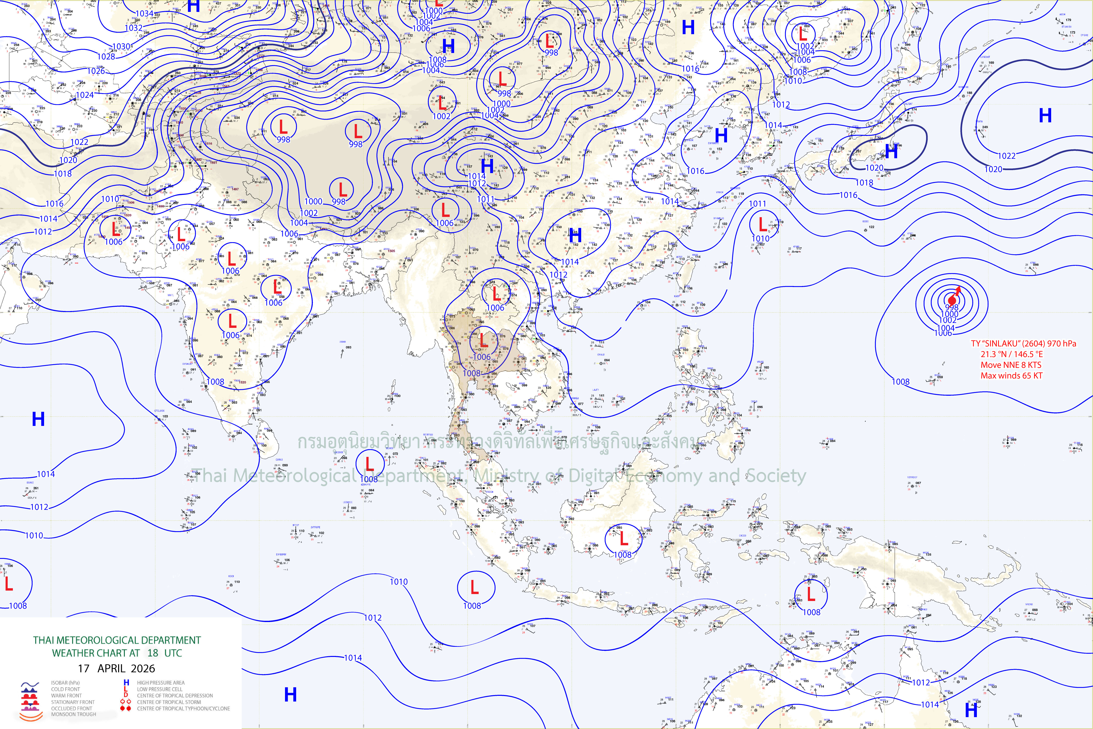 ลักษณะอากาศทั่วไป : พยากรณ์อากาศ 24 ชั่วโมงข้างหน้า บริเวณประเทศไทยตอนบนจะมีพายุฤดูร้อนเกิดขึ้น โดยมีลักษณะของพายุฝนฟ้าคะนอง ลมกระโชกแรง และลูกเห็บตกบางแห่ง รวมถึงอาจมีฟ้าผ่าเกิดขึ้นได้บางพื้นที่ เนื่องจากบริเวณความกดอากาศสูงหรือมวลอากาศเย็นได้แผ่ลงมาปกคลุมประเทศไทยตอนบน และทะเลจีนใต้ ส่งผลทำให้มีลมใต้และลมตะวันออกเฉียงใต้พัดนำความชื้นจากอ่าวไทยและทะเลจีนใต้เข้าปกคลุมภาคตะวันออกเฉียงเหนือ ภาคตะวันออก และอ่าวไทยตอนบน ในขณะที่บริเวณดังกล่าวมีอากาศร้อนถึงร้อนจัด ขอให้ประชาชนบริเวณประเทศไทยตอนบนระวังอันตรายจากพายุฤดูร้อน โดยหลีกเลี่ยงการอยู่ในที่โล่งแจ้ง ใต้ต้นไม้ใหญ่ สิ่งปลูกสร้าง และป้ายโฆษณาที่ไม่แข็งแรง สำหรับเกษตรกรควรเสริมความแข็งแรงให้ไม้ผล และเตรียมการป้องกันความเสียหายที่อาจเกิดขึ้นกับผลผลิตทางการเกษตรและสัตว์เลี้ยง รวมทั้งดูแลรักษาสุขภาพในช่วงที่สภาพอากาศเปลี่ยนแปลงไว้ด้วย และดูแลรักษาสุขภาพเนื่องจากสภาพอากาศที่ร้อนถึงร้อนจัด โดยหลีกเลี่ยงการทำงานหรือการประกอบกิจกรรมในที่โล่งแจ้งเป็นระยะเวลานาน สำหรับภาคใต้มีอากาศร้อนในตอนกลางวัน โดยมีฝนฟ้าคะนองบางแห่ง เนื่องจากลมใต้และลมตะวันออกเฉียงใต้พัดปกคลุมอ่าวไทย ภาคใต้ และทะเลอันดามัน