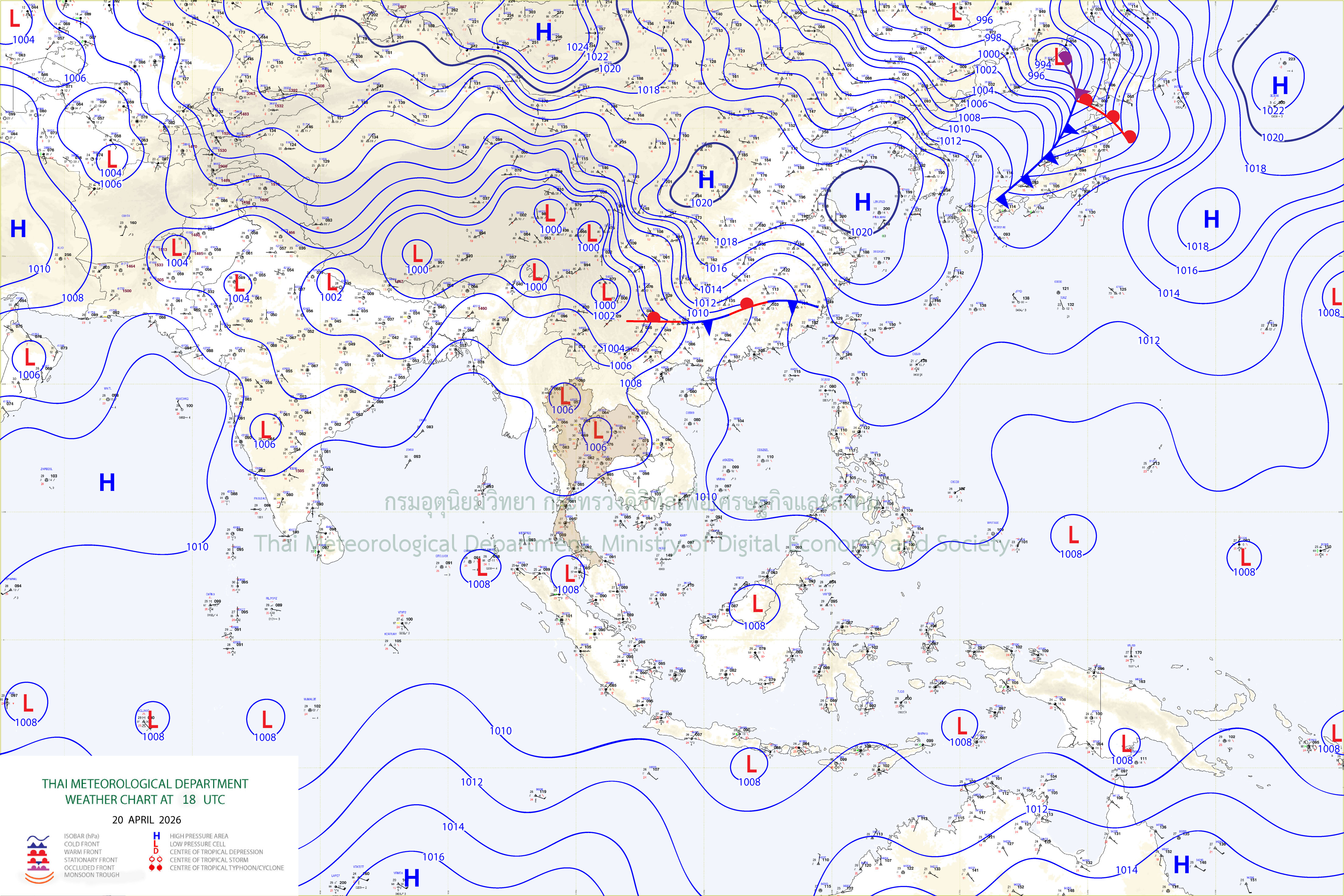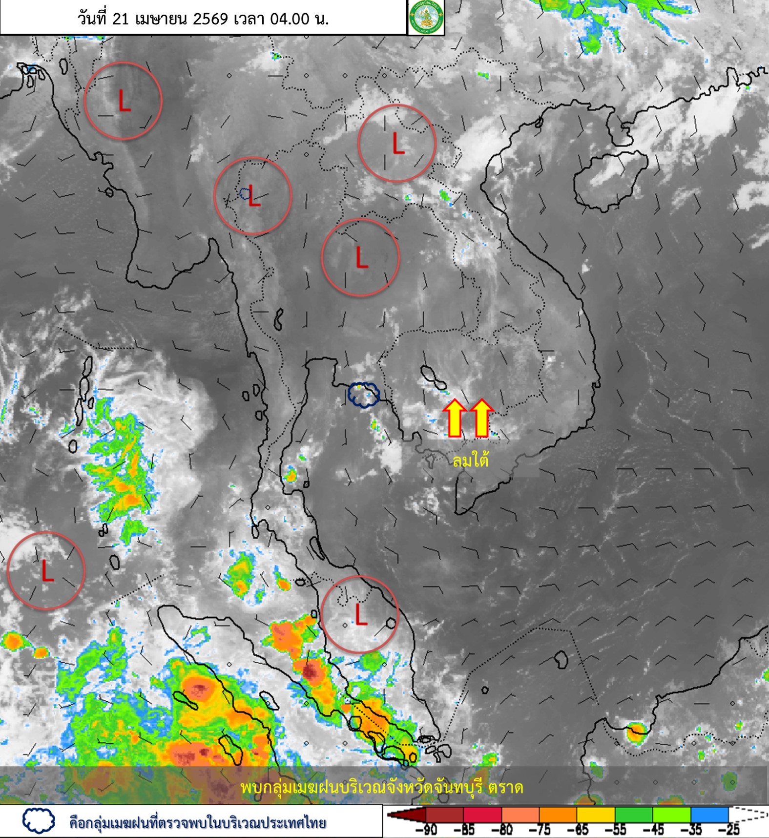 ลักษณะอากาศทั่วไป : พยากรณ์อากาศ 24 ชั่วโมงข้างหน้า บริเวณประเทศไทยตอนบนจะมีฝนลดลง แต่ยังคงมีฝนฟ้าคะนองเกิดขึ้นได้บางแห่ง โดยมีอากาศร้อนโดยทั่วไป และมีอากาศร้อนจัดบางพื้นที่บริเวณภาคเหนือ ภาคตะวันออกเฉียงเหนือ และภาคกลาง เนื่องจากหย่อมความกดอากาศต่ำเนื่องจากความร้อนปกคลุมประเทศไทยตอนบน ในขณะที่ลมใต้และลมตะวันออกเฉียงใต้ที่พัดนำความชื้นจากอ่าวไทยและทะเลจีนใต้เข้ามาปกคลุมภาคตะวันออกเฉียงเหนือ ภาคตะวันออก และอ่าวไทยตอนบนมีกำลังอ่อนลง ขอให้ประชาชนดูแลรักษาสุขภาพเนื่องจากสภาวะอากาศร้อนถึงร้อนจัด และระวังอันตรายจากฝนฟ้าคะนองและลมกระโชกแรงในระยะนี้ไว้ด้วย อนึ่ง ในช่วงวันที่ 23–25 เม.ย. 2569 ประเทศไทยตอนบนจะมีพายุฤดูร้อนเกิดขึ้น โดยมีลักษณะของพายุฝนฟ้าคะนอง ลมกระโชกแรง และลูกเห็บตกบางแห่ง รวมถึงอาจมีฟ้าผ่าเกิดขึ้นได้ โดยจะเริ่มจากภาคเหนือ ภาคตะวันออกเฉียงเหนือ และภาคตะวันออกก่อน ส่วนภาคกลาง รวมทั้งกรุงเทพมหานครและปริมณฑลจะได้รับผลกระทบ ในระยะถัดไป เนื่องจากบริเวณความกดอากาศสูงหรือมวลอากาศเย็นจากประเทศจีนอีกระลอกหนึ่งจะแผ่ลงมาปกคลุมทะเลจีนใต้ และภาคตะวันออกเฉียงเหนือ ในขณะที่ประเทศไทยตอนบนมีอากาศร้อนถึงร้อนจัด