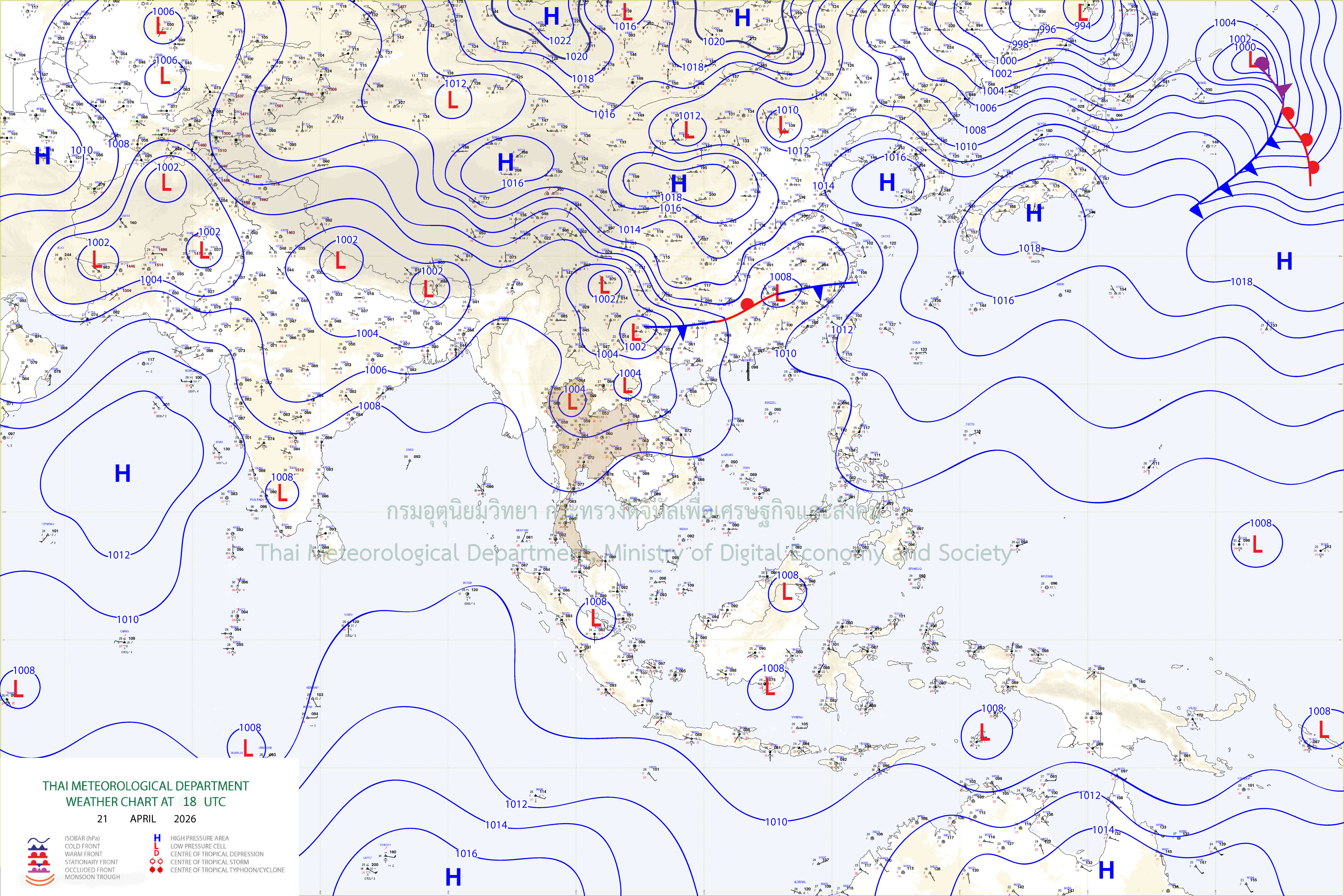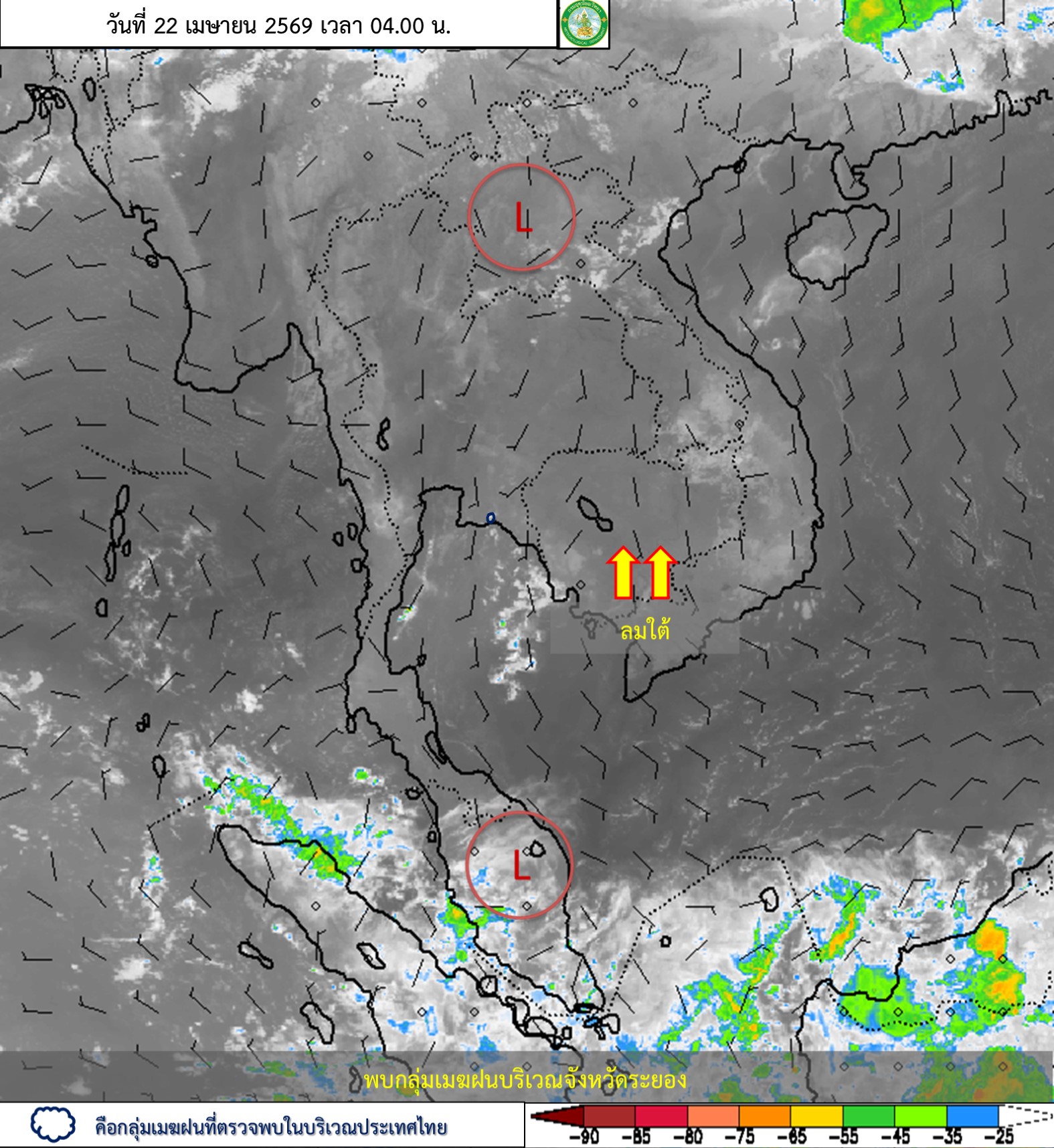 ลักษณะอากาศทั่วไป : พยากรณ์อากาศ 24 ชั่วโมงข้างหน้า บริเวณประเทศไทยตอนบนมีฝนลดลง แต่ยังคงมีฝนฟ้าคะนองกับมีลมกระโชกแรงเกิดขึ้นได้บางแห่ง โดยมีอากาศร้อนโดยทั่วไป และมีอากาศร้อนจัดบางพื้นที่บริเวณภาคเหนือ และภาคกลาง เนื่องจากหย่อมความกดอากาศต่ำเนื่องจากความร้อนปกคลุมประเทศไทยตอนบน ในขณะที่ลมใต้และลมตะวันออกเฉียงใต้ที่พัดนำความชื้นจากอ่าวไทยและทะเลจีนใต้เข้ามาปกคลุมภาคตะวันออกเฉียงเหนือ ภาคตะวันออก และอ่าวไทยตอนบนมีกำลังอ่อนลง ขอให้ประชาชนดูแลรักษาสุขภาพเนื่องจากสภาวะอากาศร้อนถึงร้อนจัด และระวังอันตรายจากฝนฟ้าคะนองและลมกระโชกแรงในระยะนี้ไว้ด้วย