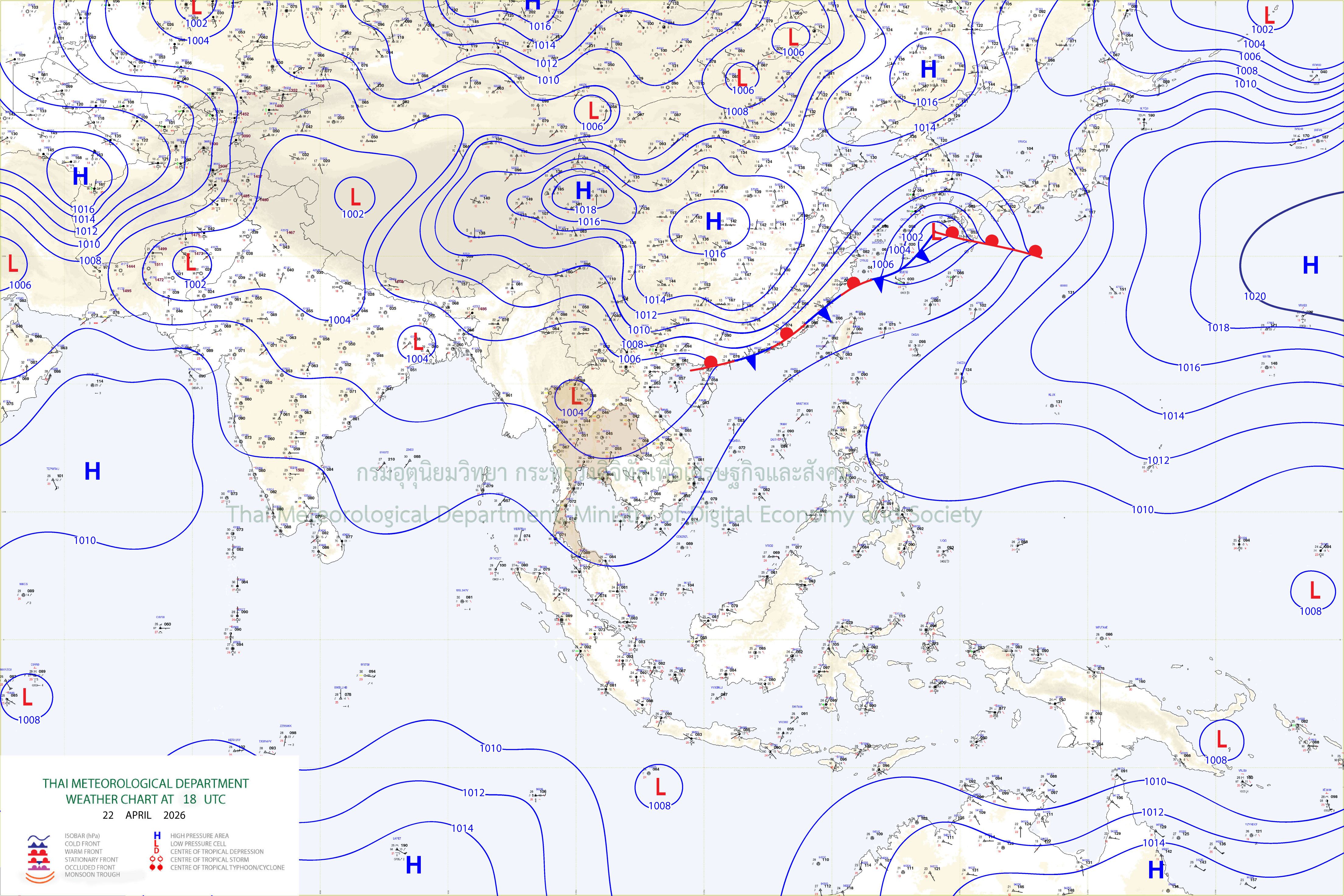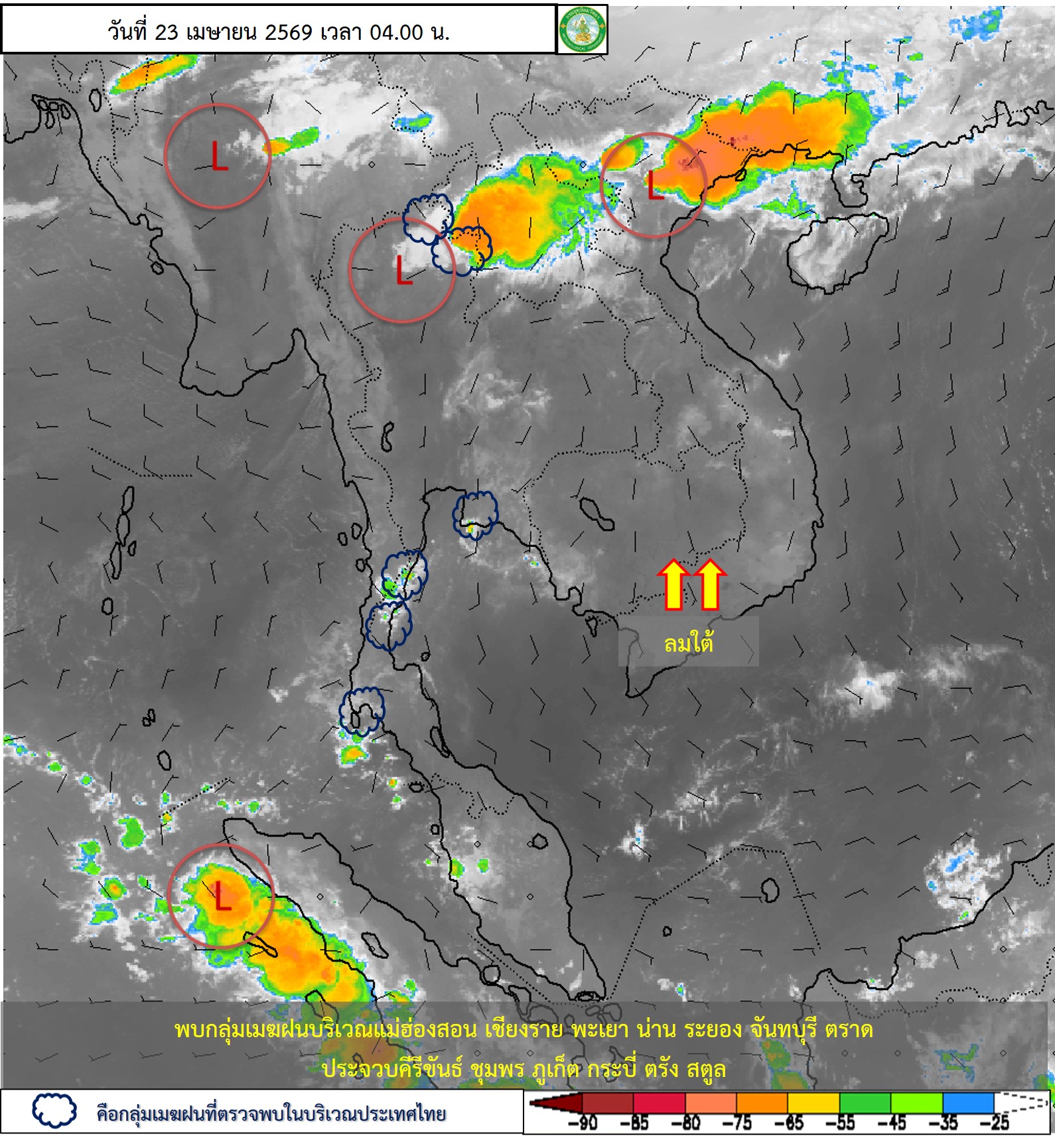 ลักษณะอากาศทั่วไป : พยากรณ์อากาศ 24 ชั่วโมงข้างหน้า ภาคเหนือ และภาคตะวันออกเฉียงเหนือจะมีพายุฤดูร้อนเกิดขึ้น โดยมีลักษณะของพายุฝนฟ้าคะนอง ลมกระโชกแรง ลูกเห็บตก และฝนตกหนักบางแห่ง รวมถึงอาจมีฟ้าผ่าเกิดขึ้นได้บางพื้นที่ เนื่องจากบริเวณความกดอากาศสูงหรือมวลอากาศเย็นจากประเทศจีนได้แผ่ลงมาปกคลุมประเทศเวียดนามตอนบนแล้ว คาดว่าจะแผ่ลงมาปกคลุมภาคตะวันออกเฉียงเหนือ และทะเลจีนใต้ในวันนี้ (23 เม.ย. 69) ในขณะที่ประเทศไทยตอนบนมีอากาศร้อนถึงร้อนจัดขอให้ประชาชนในบริเวณดังกล่าวระวังอันตรายจากพายุฤดูร้อน โดยหลีกเลี่ยงการอยู่ในที่โล่งแจ้ง ใต้ต้นไม้ใหญ่ สิ่งปลูกสร้าง และป้ายโฆษณาที่ไม่แข็งแรง สำหรับเกษตรกรควรเสริมความแข็งแรงให้ไม้ผล และเตรียมการป้องกันความเสียหายที่อาจเกิดขึ้นกับผลผลิตทางการเกษตรและสัตว์เลี้ยง รวมทั้งดูแลรักษาสุขภาพในช่วงที่สภาพอากาศเปลี่ยนแปลงไว้ด้วย