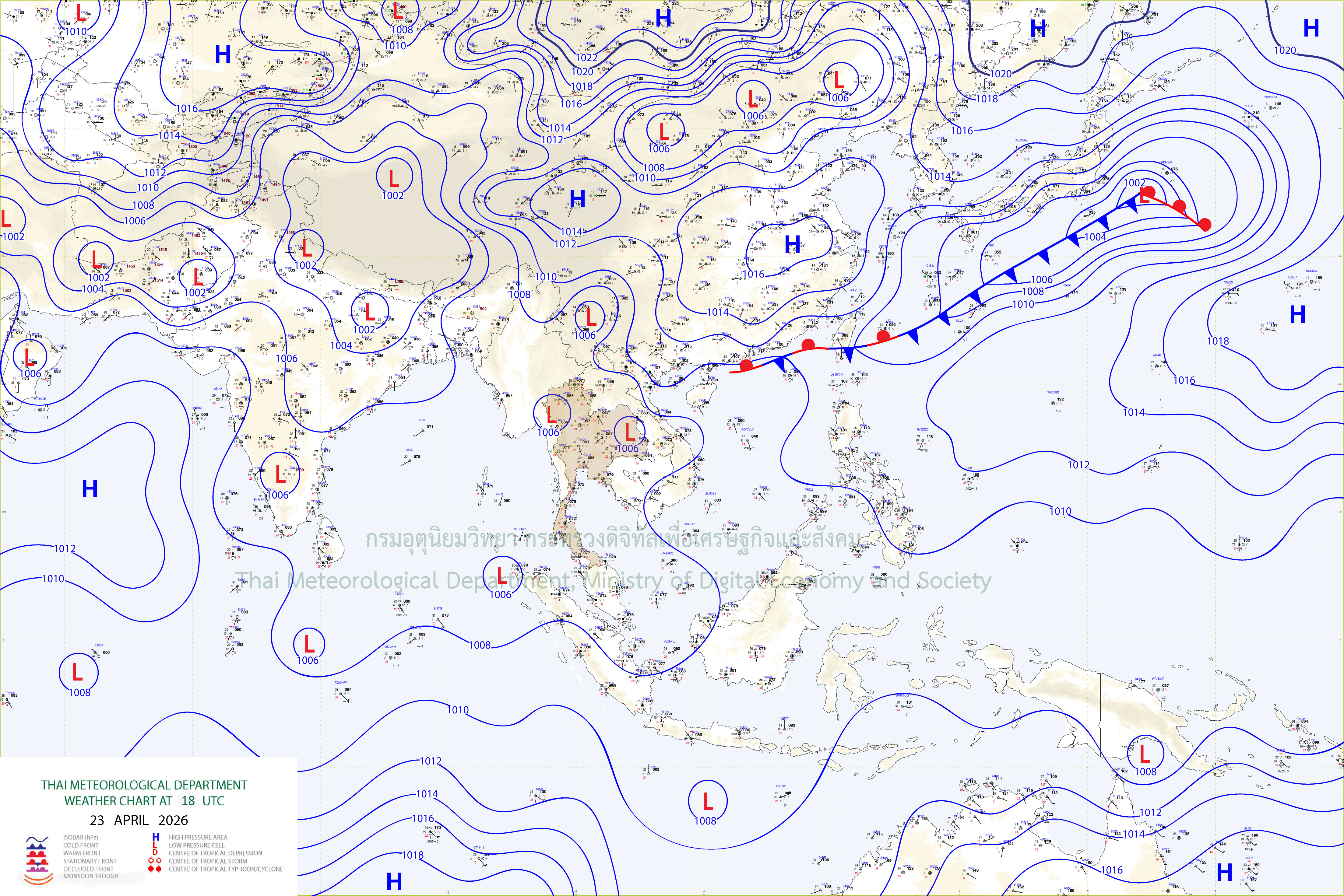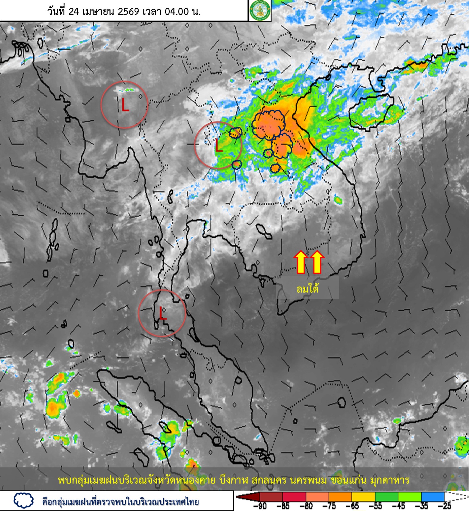 ลักษณะอากาศทั่วไป : พยากรณ์อากาศ 24 ชั่วโมงข้างหน้า ประเทศไทยตอนบนจะมีพายุฤดูร้อนเกิดขึ้น โดยมีลักษณะของพายุฝนฟ้าคะนอง ลมกระโชกแรง ลูกเห็บตก และฝนตกหนักบางแห่ง รวมถึงอาจมีฟ้าผ่าเกิดขึ้นได้บางพื้นที่ เนื่องจากบริเวณความกดอากาศสูงหรือมวลอากาศเย็นจากประเทศจีนจะแผ่ลงมาปกคลุมภาคตะวันออกเฉียงเหนือ และทะเลจีนใต้ ในขณะที่ประเทศไทยตอนบนมีอากาศร้อนถึงร้อนจัดขอให้ประชาชนในบริเวณดังกล่าวระวังอันตรายจากพายุฤดูร้อน โดยหลีกเลี่ยงการอยู่ในที่โล่งแจ้ง ใต้ต้นไม้ใหญ่ สิ่งปลูกสร้าง และป้ายโฆษณาที่ไม่แข็งแรง สำหรับเกษตรกรควรเสริมความแข็งแรงให้ไม้ผล และเตรียมการป้องกันความเสียหายที่อาจเกิดขึ้นกับผลผลิตทางการเกษตรและสัตว์เลี้ยง รวมทั้งดูแลรักษาสุขภาพในช่วงที่สภาพอากาศเปลี่ยนแปลงไว้ด้วย