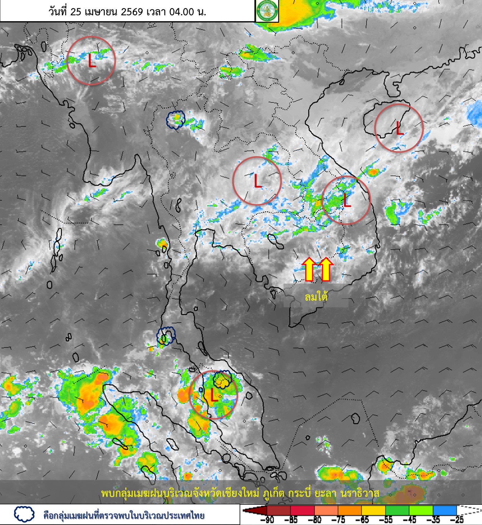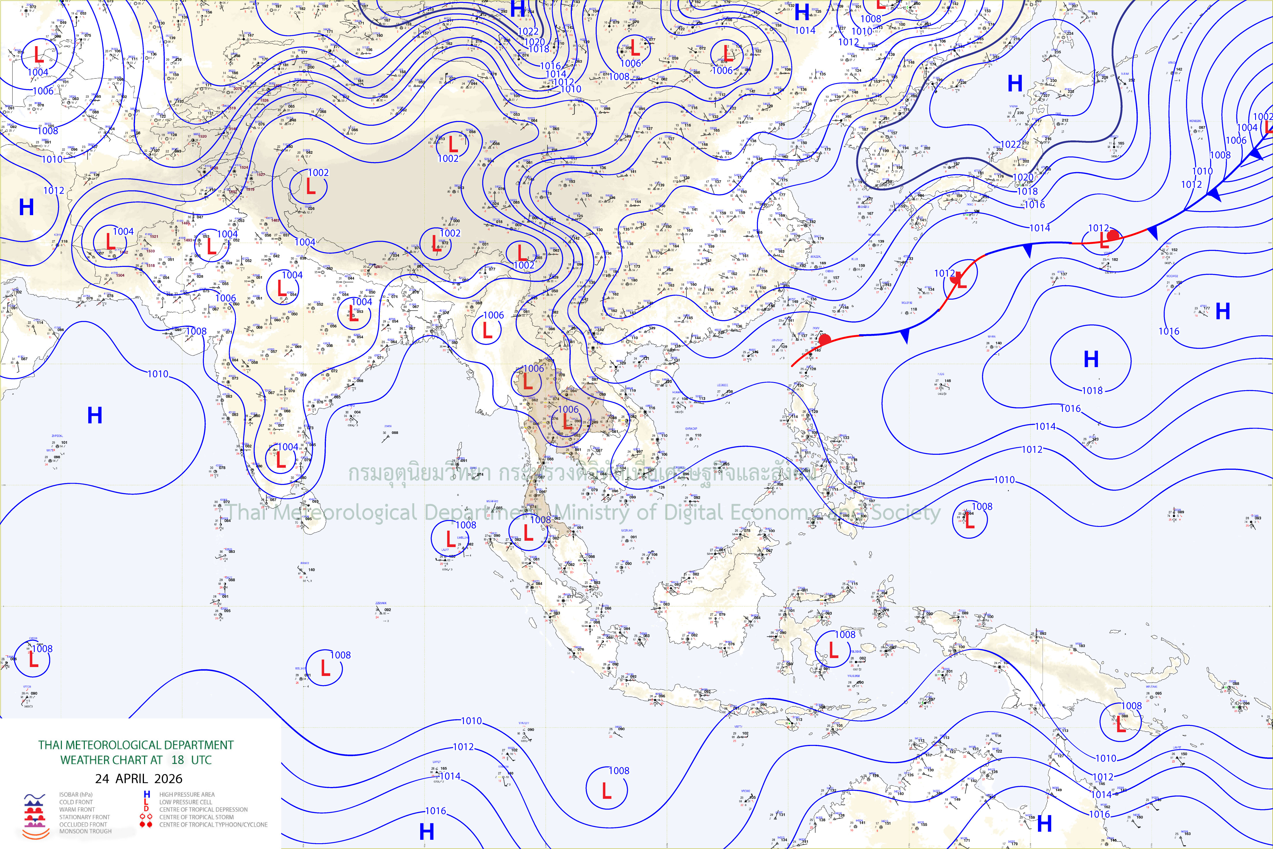 ลักษณะอากาศทั่วไป : พยากรณ์อากาศ 24 ชั่วโมงข้างหน้า บริเวณด้านตะวันตกและตอนล่างของภาคตะวันออกเฉียงเหนือ ภาคเหนือ ภาคกลาง รวมทั้งกรุงเทพมหานครและปริมณฑล และภาคตะวันออก จะมีพายุฤดูร้อนเกิดขึ้น โดยมีลักษณะของพายุฝนฟ้าคะนอง ลมกระโชกแรง ลูกเห็บตก และฝนตกหนักบางแห่ง รวมถึงอาจมีฟ้าผ่าเกิดขึ้นได้บางพื้นที่ เนื่องจากบริเวณความกดอากาศสูงหรือมวลอากาศเย็นจากประเทศจีนแผ่ลงมาปกคลุมภาคตะวันออกเฉียงเหนือ และทะเลจีนใต้ ในขณะที่ประเทศไทยตอนบนมีอากาศร้อน ขอให้ประชาชนในบริเวณดังกล่าวระวังอันตรายจากพายุฤดูร้อน โดยหลีกเลี่ยงการอยู่ในที่โล่งแจ้ง ใต้ต้นไม้ใหญ่ สิ่งปลูกสร้าง และป้ายโฆษณาที่ไม่แข็งแรง สำหรับเกษตรกรควรเสริมความแข็งแรงให้ไม้ผล และเตรียมการป้องกันความเสียหายที่อาจเกิดขึ้นกับผลผลิตทางการเกษตรและสัตว์เลี้ยง รวมทั้งดูแลรักษาสุขภาพในช่วงที่สภาพอากาศเปลี่ยนแปลงไว้ด้วย สำหรับภาคใต้มีฝนฟ้าคะนองบางแห่ง เนื่องจากลมตะวันออกและลมตะวันออกเฉียงใต้พัดปกคลุมอ่าวไทย ภาคใต้ และทะเลอันดามัน ส่วนบริเวณอ่าวไทยมีคลื่นสูงประมาณ 1 เมตร บริเวณที่มีฝนฟ้าคะนองคลื่นสูงมากกว่า 1 เมตร ขอให้ชาวเรือหลีกเลี่ยงการเดินเรือในบริเวณที่มีฝนฟ้าคะนอง