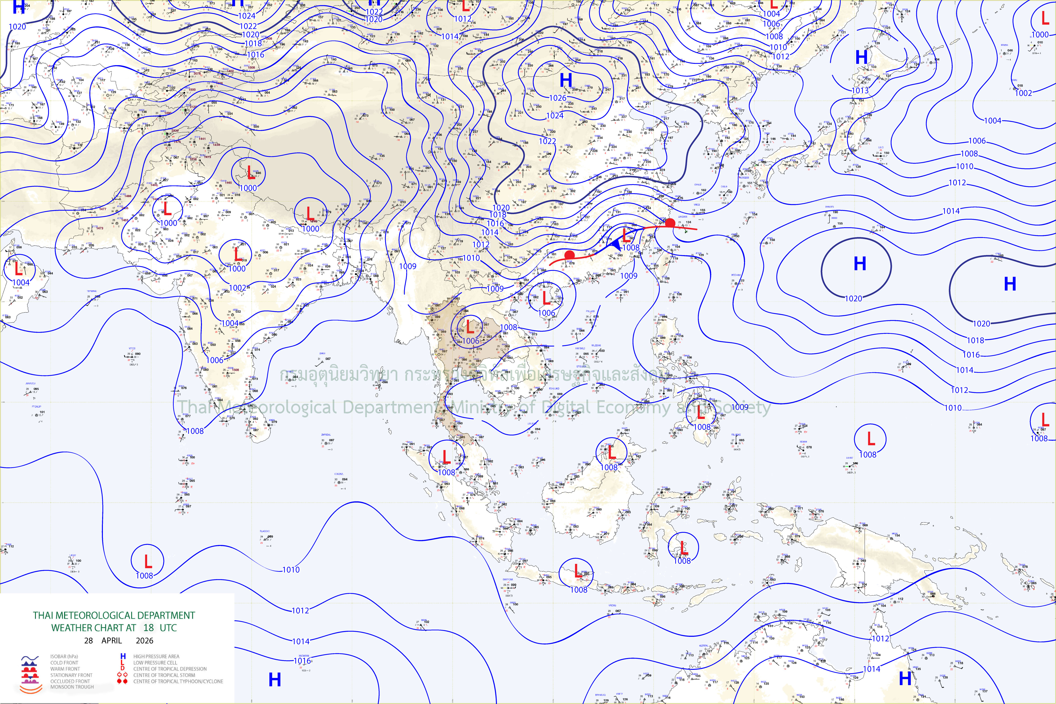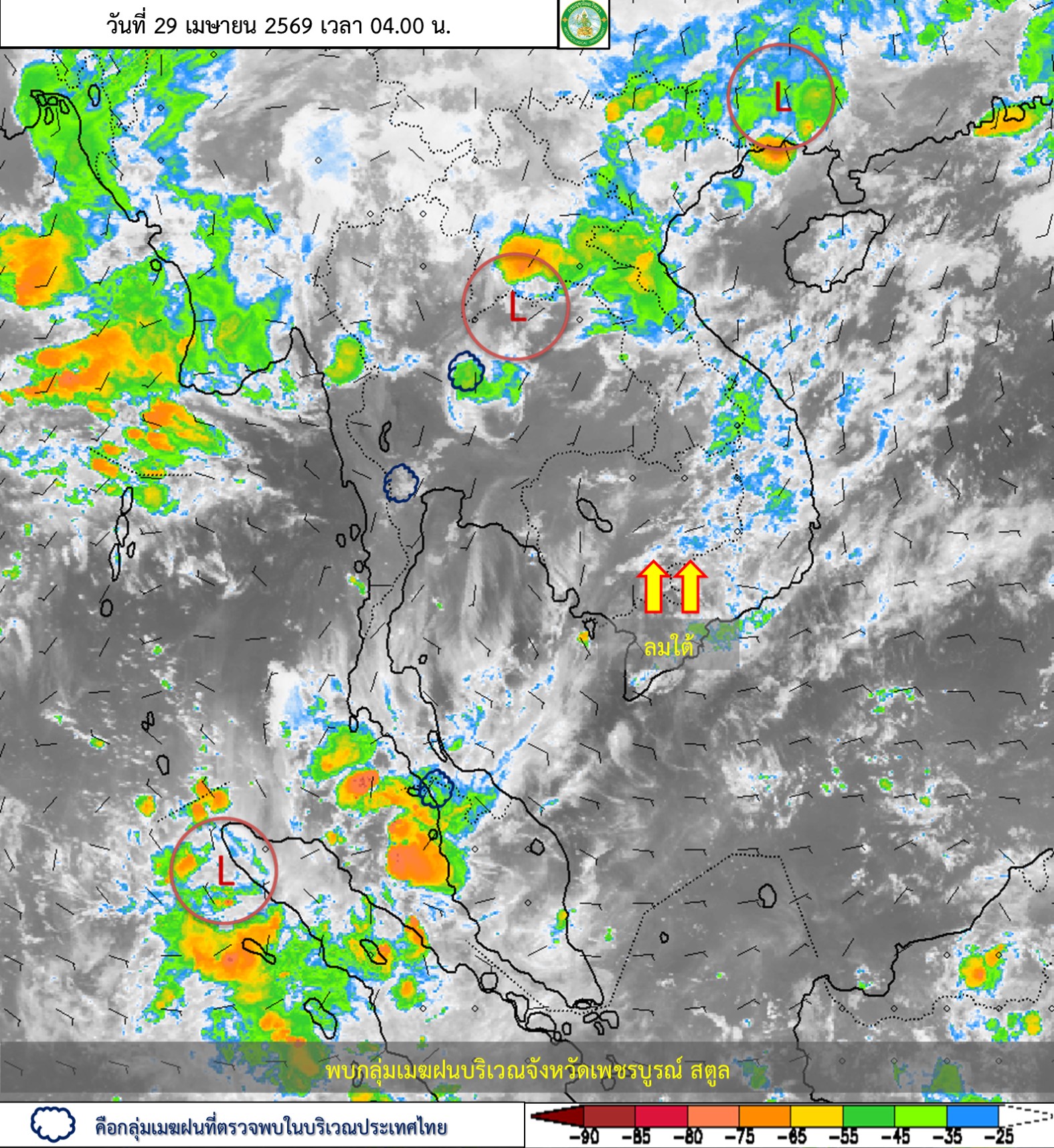 ลักษณะอากาศทั่วไป : พยากรณ์อากาศ 24 ชั่วโมงข้างหน้า บริเวณภาคเหนือ ภาคตะวันออกเฉียงเหนือ และภาคตะวันออก จะมีพายุฤดูร้อนเกิดขึ้น โดยมีลักษณะของพายุฝนฟ้าคะนอง ลมกระโชกแรง และลูกเห็บตกบางแห่ง รวมถึงอาจมีฟ้าผ่าเกิดขึ้นได้ เนื่องจากบริเวณความกดอากาศสูงหรือมวลอากาศเย็นจากประเทศจีนอีกระลอกหนึ่งได้แผ่ลงมาปกคลุมประเทศลาวตอนบนและเวียดนามตอนบนแล้ว คาดว่าจะแผ่ลงมาปกคลุมภาคตะวันออกเฉียงเหนือ และทะเลจีนใต้ในวันนี้ (29 เม.ย. 69) ในขณะที่ประเทศไทยตอนบนมีอากาศร้อนถึงร้อนจัด ขอให้ประชาชนในบริเวณดังกล่าวระวังอันตรายจากพายุฤดูร้อน โดยหลีกเลี่ยงการอยู่ในที่โล่งแจ้ง ใต้ต้นไม้ใหญ่ สิ่งปลูกสร้าง และป้ายโฆษณาที่ไม่แข็งแรง สำหรับเกษตรกรควรเสริมความแข็งแรงให้ไม้ผล และเตรียมการป้องกันความเสียหายที่อาจเกิดขึ้นกับผลผลิตทางการเกษตรและสัตว์เลี้ยง รวมทั้งดูแลรักษาสุขภาพในช่วงที่สภาพอากาศเปลี่ยนแปลงไว้ด้วย สำหรับภาคใต้มีฝนฟ้าคะนองบางแห่ง เนื่องจากลมใต้และลมตะวันออกเฉียงใต้พัดปกคลุมอ่าวไทย ภาคใต้ และทะเลอันดามัน