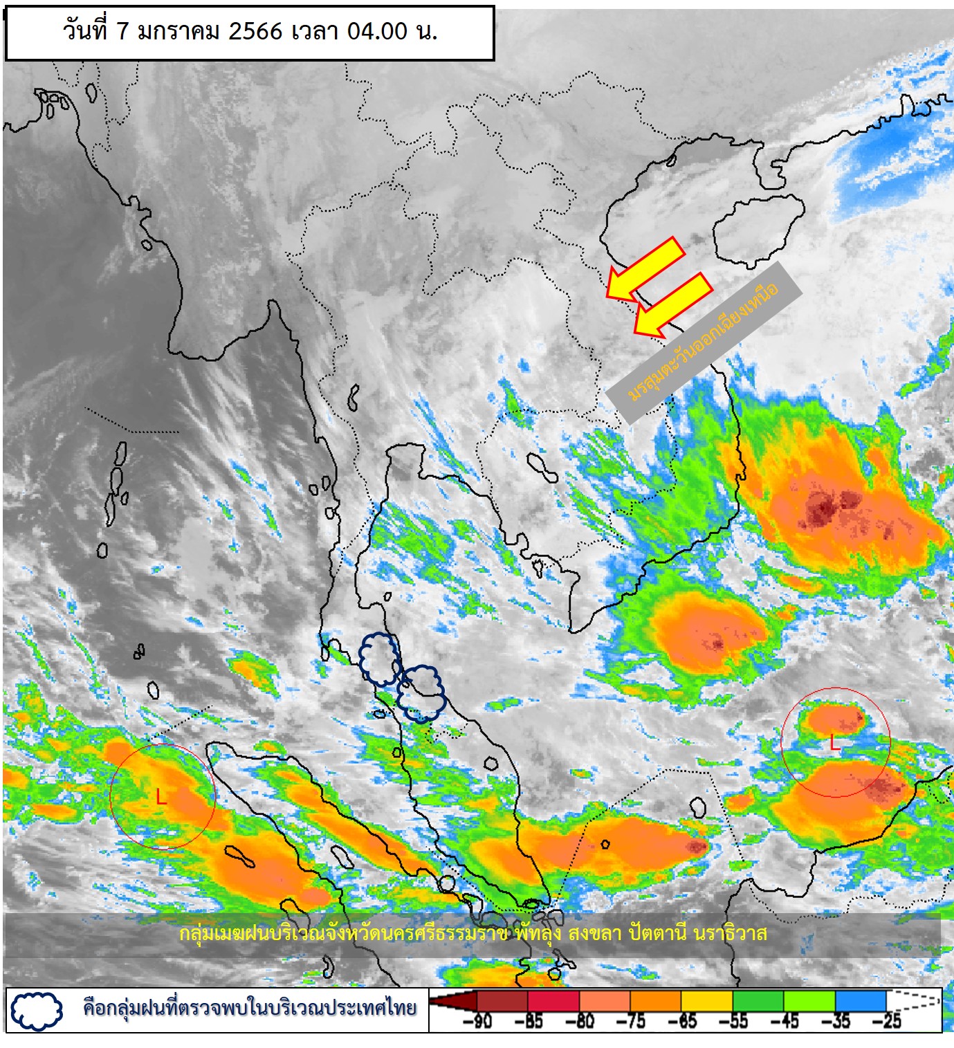 ลักษณะอากาศทั่วไป : พยากรณ์อากาศ 24 ชั่วโมงข้างหน้า บริเวณความกดอากาศสูงหรือมวลอากาศเย็นกำลังค่อนข้างแรงยังคงแผ่ปกคลุมประเทศไทยตอนบนและทะเลจีนใต้ ลักษณะเช่นนี้ทำให้ประเทศไทยตอนบนมีอากาศเย็นถึงหนาวในตอนเช้า และอุณหภูมิจะลดลง 1-3 องศาเซลเซียส กับมีลมแรง โดยมีฝนเล็กน้อยบางแห่งบริเวณภาคตะวันออกเฉียงเหนือตอนล่างและภาคตะวันออก ขอให้ประชาชนบริเวณประเทศไทยตอนบนดูแลรักษาสุขภาพเนื่องจากสภาพอากาศที่เปลี่ยนแปลงและอากาศที่หนาวเย็นลง รวมถึงระวังอันตรายจากอัคคีภัยที่เกิดจากสภาพอากาศแห้งในระยะนี้ไว้ด้วย สำหรับมรสุมตะวันออกเฉียงเหนือที่พัดปกคลุมอ่าวไทยและภาคใต้มีกำลังแรง ประกอบกับมีหย่อมความกดอากาศต่ำปกคลุมบริเวณทะเลจีนใต้ตอนล่างและมีแนวโน้มเคลื่อนเข้าใกล้บริเวณปลายแหลมญวน ทำให้ภาคใต้ตอนล่างมีฝนตกหนักบางแห่ง ส่วนคลื่นลมบริเวณอ่าวไทยตอนล่างมีกำลังแรง โดยมีคลื่นสูง 2-4 เมตร บริเวณที่มีฝนฟ้าคะนองคลื่นสูงมากกว่า 4 เมตร ขอให้ชาวเรือบริเวณอ่าวไทยเดินเรือด้วยความระมัดระวัง และหลีกเลี่ยงการเดินเรือในบริเวณที่มีฝนฟ้าคะนอง ส่วนเรือเล็กในบริเวณดังกล่าวควรงดออกจากฝั่งจนถึงวันที่ 8 มกราคม 2566 รวมทั้งระวังอันตรายจากคลื่นลมแรงที่ซัดเข้าหาฝั่งในระยะนี้ไว้ด้วย