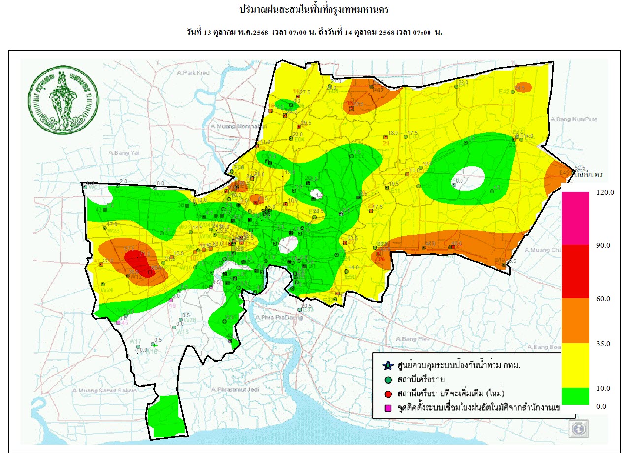 วันที่ 14 ตุลาคม 2568 เวลา 13.45 น. / พื้นที่ กทม. ฝนเล็กน้อยถึงปานกลาง เขตดอนเมือง หลักสี่ จตุจักร บางซื่อ ตลิ่งชัน ลาดพร้าว บึงกุ่ม คันนายาว มีนบุรี สะพานสูง หนองจอก เคลื่อนตัวทิศตะวันตกเฉียงเหนือ แนวโน้มลดลง  แต่มีกลุ่ม ฝนจากฉะเชิงเทรา เคลื่อนตัวคาดว่าจะเข้าเขตลาดกระบัง ภายในเวลาไม่เกิน 1ชั่วโมง /ฝนรวมที่เขตพระนคร 50.0 มม