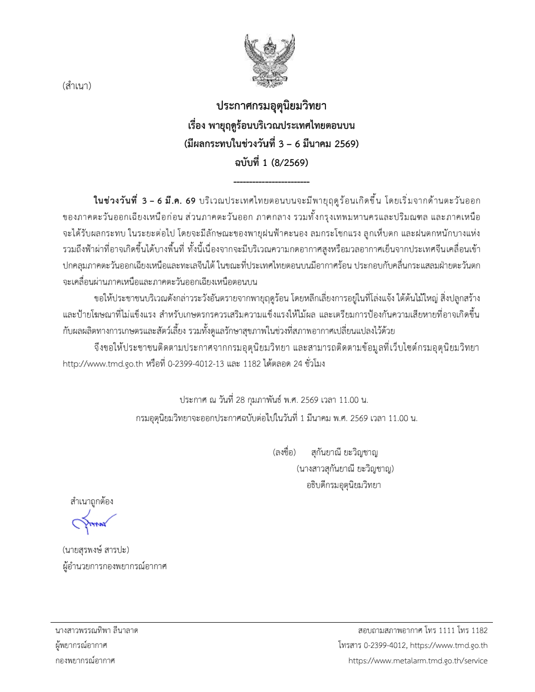 ประกาศกรมอุตุนิยมวิทยา เรื่อง พายุฤดูร้อนบริเวณประเทศไทยตอนบน (มีผลกระทบในช่วงวันที่ 3 – 6 มีนาคม 2569) ฉบับที่ 2 ประกาศกรมอุตุนิยมวิทยา เรื่อง พายุฤดูร้อนบริเวณประเทศไทยตอนบน (มีผลกระทบในช่วงวันที่ 3 – 6 มีนาคม 2569) ฉบับที่ 2 ประกาศกรมอุตุนิยมวิทยา เรื่อง พายุฤดูร้อนบริเวณประเทศไทยตอนบน (มีผลกระทบในช่วงวันที่ 3 – 6 มีนาคม 2569) ฉบับที่ 2