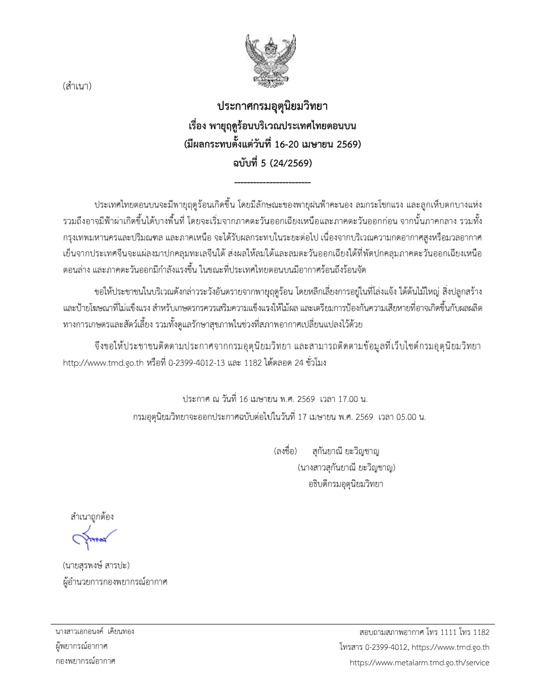 ประกาศกรมอุตุนิยมวิทยา เรื่อง พายุฤดูร้อนบริเวณประเทศไทยตอนบน (มีผลกระทบตั้งแต่วันที่ 16-20 เมษายน 2569) ฉบับที่ 5 ประกาศกรมอุตุนิยมวิทยา เรื่อง พายุฤดูร้อนบริเวณประเทศไทยตอนบน (มีผลกระทบตั้งแต่วันที่ 16-20 เมษายน 2569) ฉบับที่ 5 ประกาศกรมอุตุนิยมวิทยา เรื่อง พายุฤดูร้อนบริเวณประเทศไทยตอนบน (มีผลกระทบตั้งแต่วันที่ 16-20 เมษายน 2569) ฉบับที่ 5
