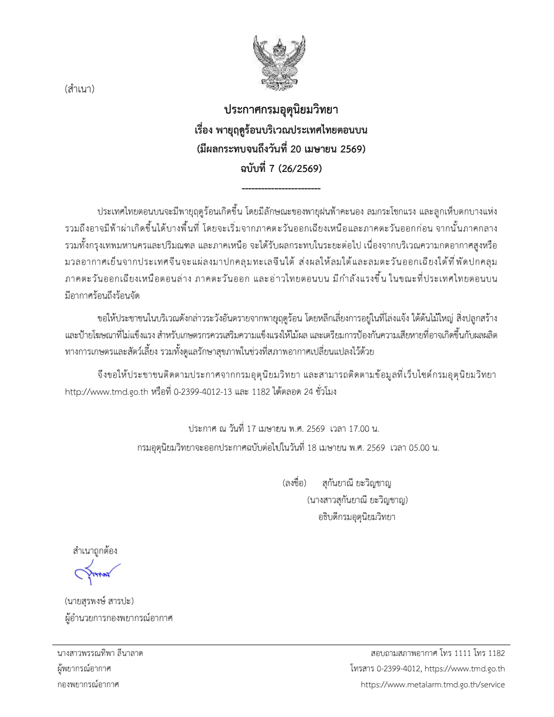 ประกาศกรมอุตุนิยมวิทยา เรื่อง พายุฤดูร้อนบริเวณประเทศไทยตอนบน (มีผลกระทบจนถึงวันที่ 20 เมษายน 2569) ฉบับที่ 7 ประกาศกรมอุตุนิยมวิทยา เรื่อง พายุฤดูร้อนบริเวณประเทศไทยตอนบน (มีผลกระทบจนถึงวันที่ 20 เมษายน 2569) ฉบับที่ 7 ประกาศกรมอุตุนิยมวิทยา เรื่อง พายุฤดูร้อนบริเวณประเทศไทยตอนบน (มีผลกระทบจนถึงวันที่ 20 เมษายน 2569) ฉบับที่ 7