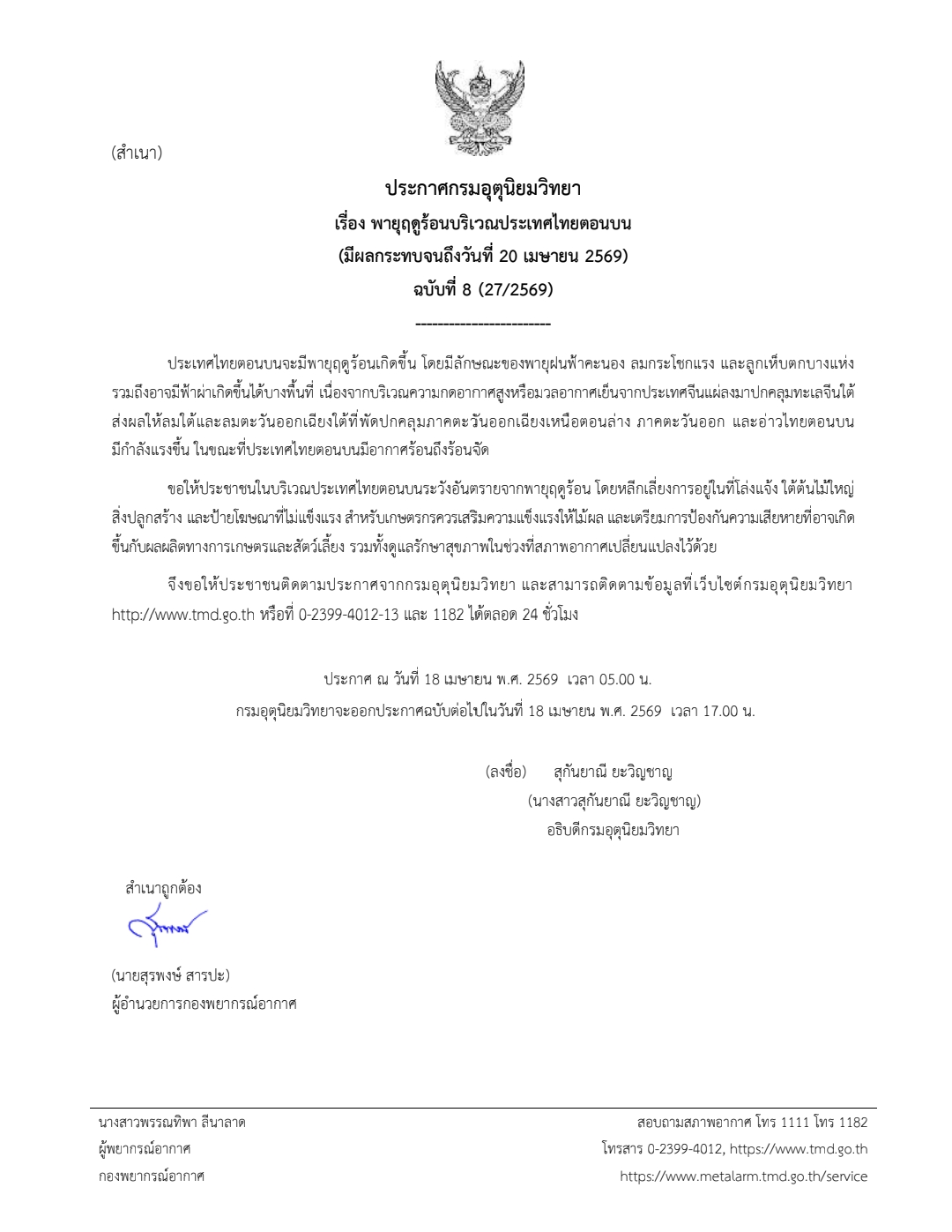 ประกาศกรมอุตุนิยมวิทยา เรื่อง พายุฤดูร้อนบริเวณประเทศไทยตอนบน (มีผลกระทบจนถึงวันที่ 20 เมษายน 2569) ฉบับที่ 8 ประกาศกรมอุตุนิยมวิทยา เรื่อง พายุฤดูร้อนบริเวณประเทศไทยตอนบน (มีผลกระทบจนถึงวันที่ 20 เมษายน 2569) ฉบับที่ 8 ประกาศกรมอุตุนิยมวิทยา เรื่อง พายุฤดูร้อนบริเวณประเทศไทยตอนบน (มีผลกระทบจนถึงวันที่ 20 เมษายน 2569) ฉบับที่ 8