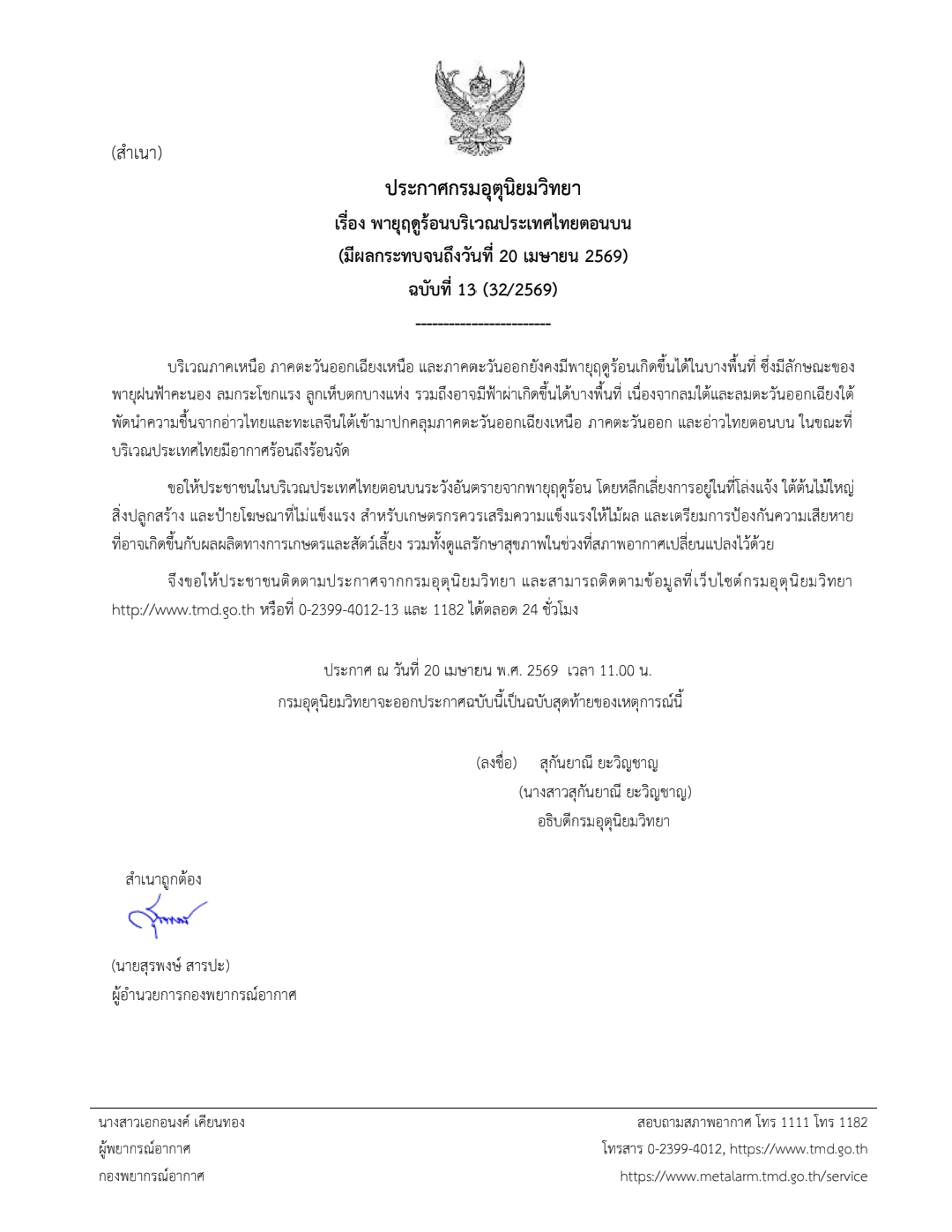 ประกาศกรมอุตุนิยมวิทยา เรื่อง พายุฤดูร้อนบริเวณประเทศไทยตอนบน (มีผลกระทบจนถึงวันที่ 20 เมษายน 2569) ฉบับที่ 13 ประกาศกรมอุตุนิยมวิทยา เรื่อง พายุฤดูร้อนบริเวณประเทศไทยตอนบน (มีผลกระทบจนถึงวันที่ 20 เมษายน 2569) ฉบับที่ 13 ประกาศกรมอุตุนิยมวิทยา เรื่อง พายุฤดูร้อนบริเวณประเทศไทยตอนบน (มีผลกระทบจนถึงวันที่ 20 เมษายน 2569) ฉบับที่ 13