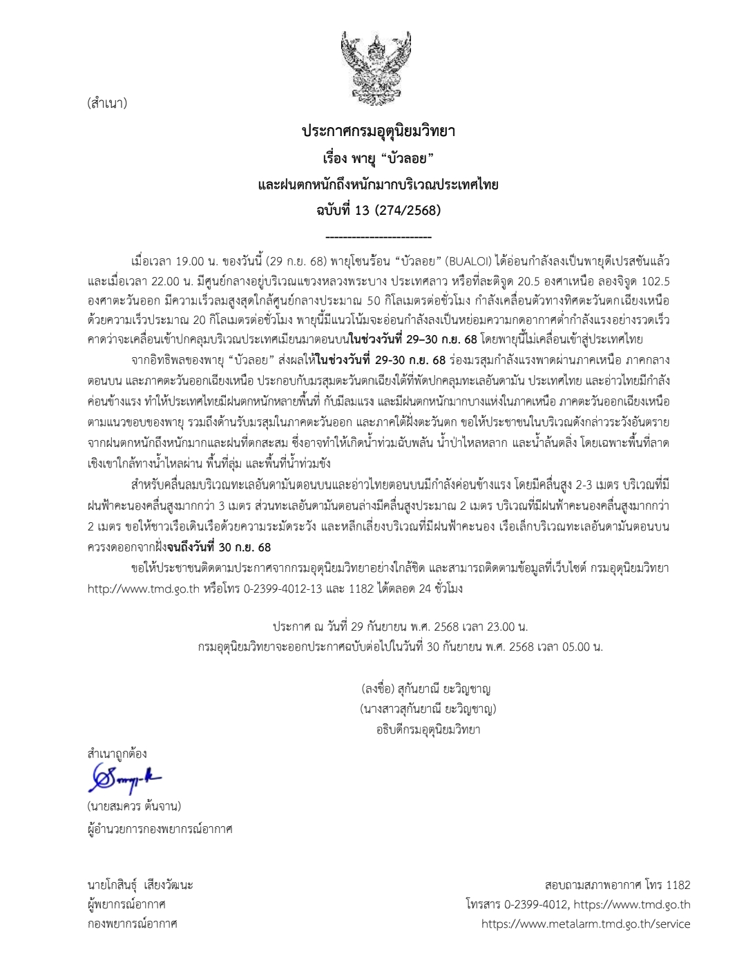 ประกาศกรมอุตุนิยมวิทยา เรื่อง พายุ “บัวลอย” และฝนตกหนักถึงหนักมากบริเวณประเทศไทยตอนบน ฉบับที่ 13 ประกาศกรมอุตุนิยมวิทยา เรื่อง พายุ “บัวลอย” และฝนตกหนักถึงหนักมากบริเวณประเทศไทยตอนบน ฉบับที่ 13 ประกาศกรมอุตุนิยมวิทยา เรื่อง พายุ “บัวลอย” และฝนตกหนักถึงหนักมากบริเวณประเทศไทยตอนบน ฉบับที่ 13